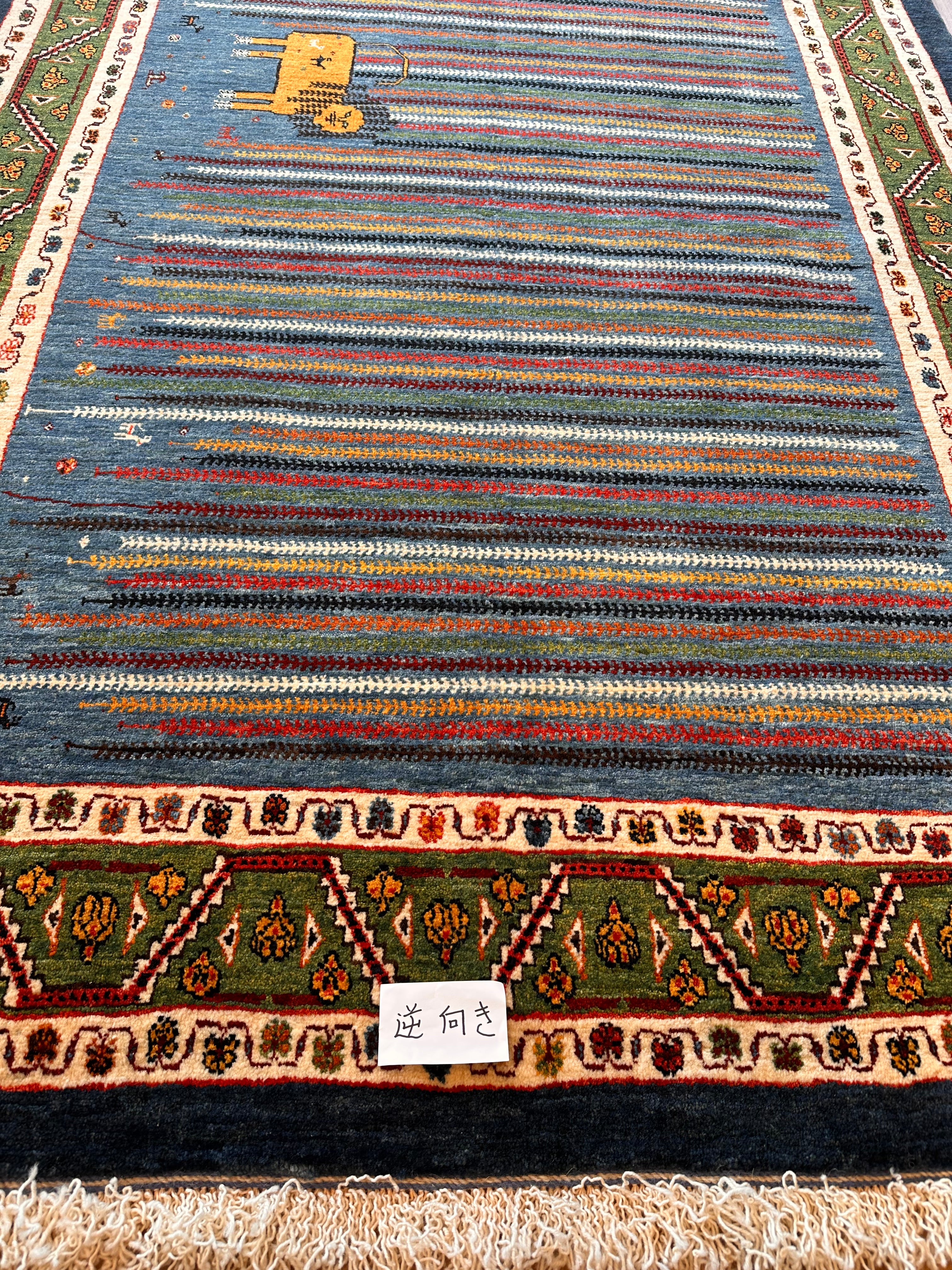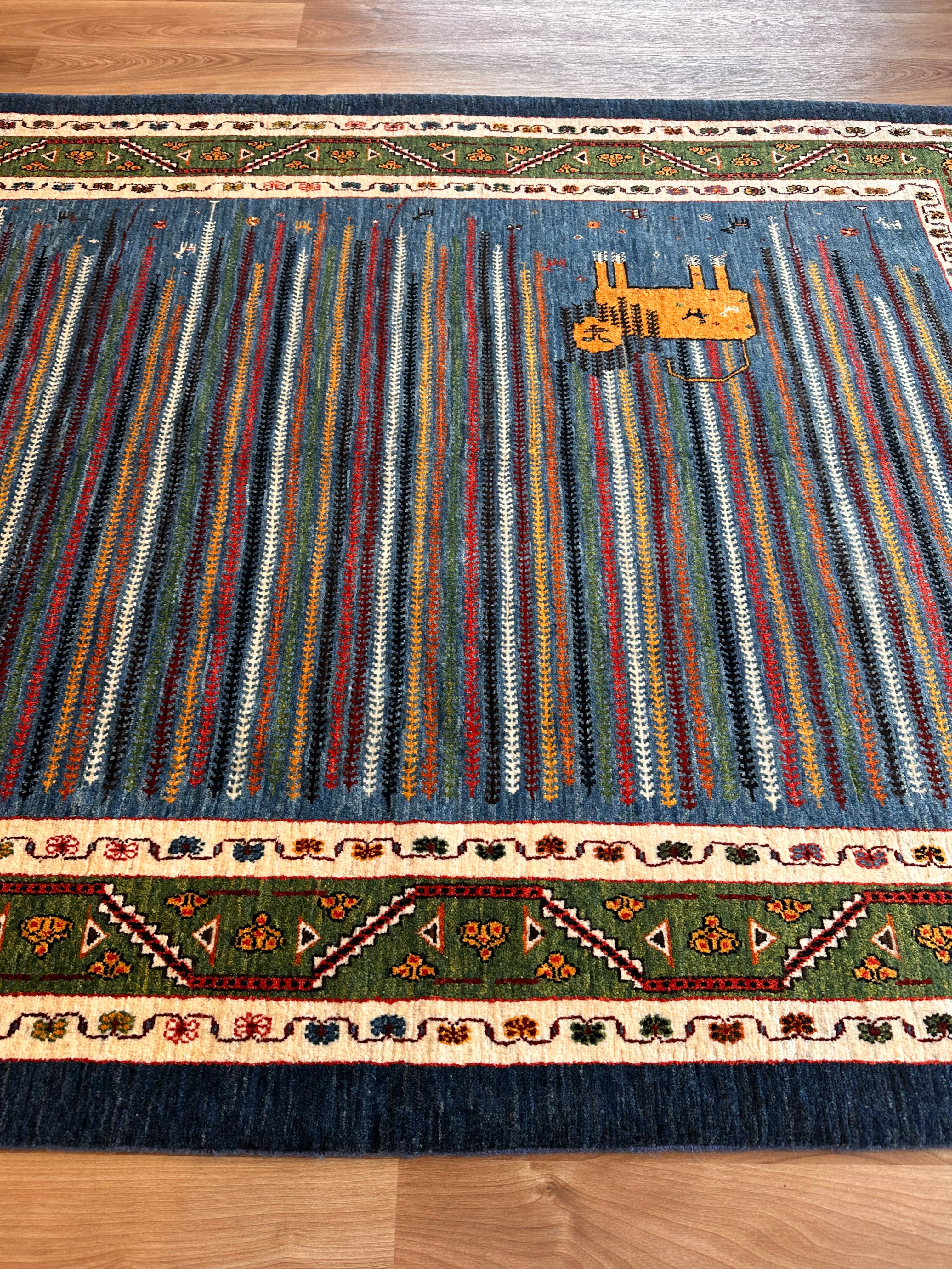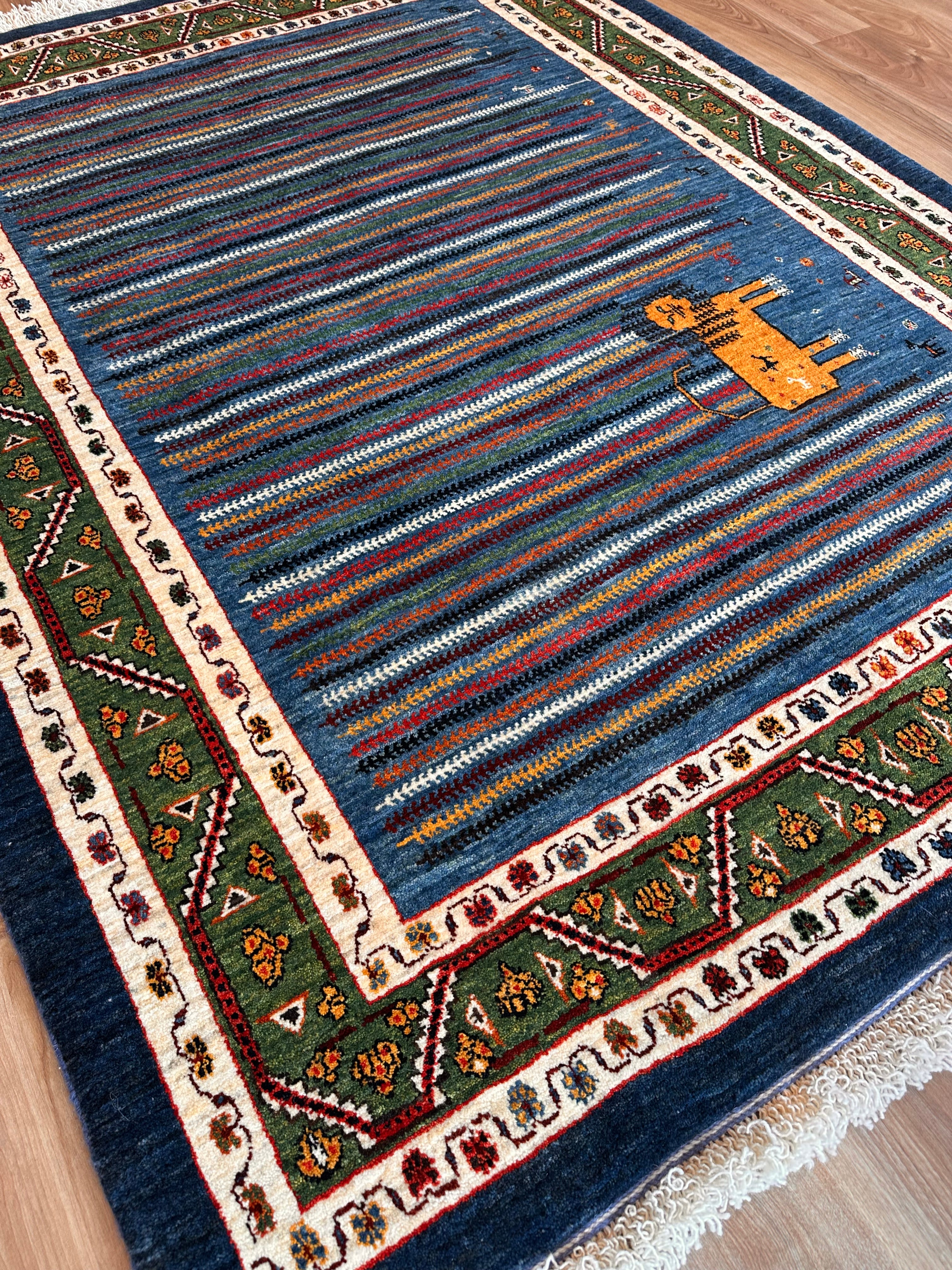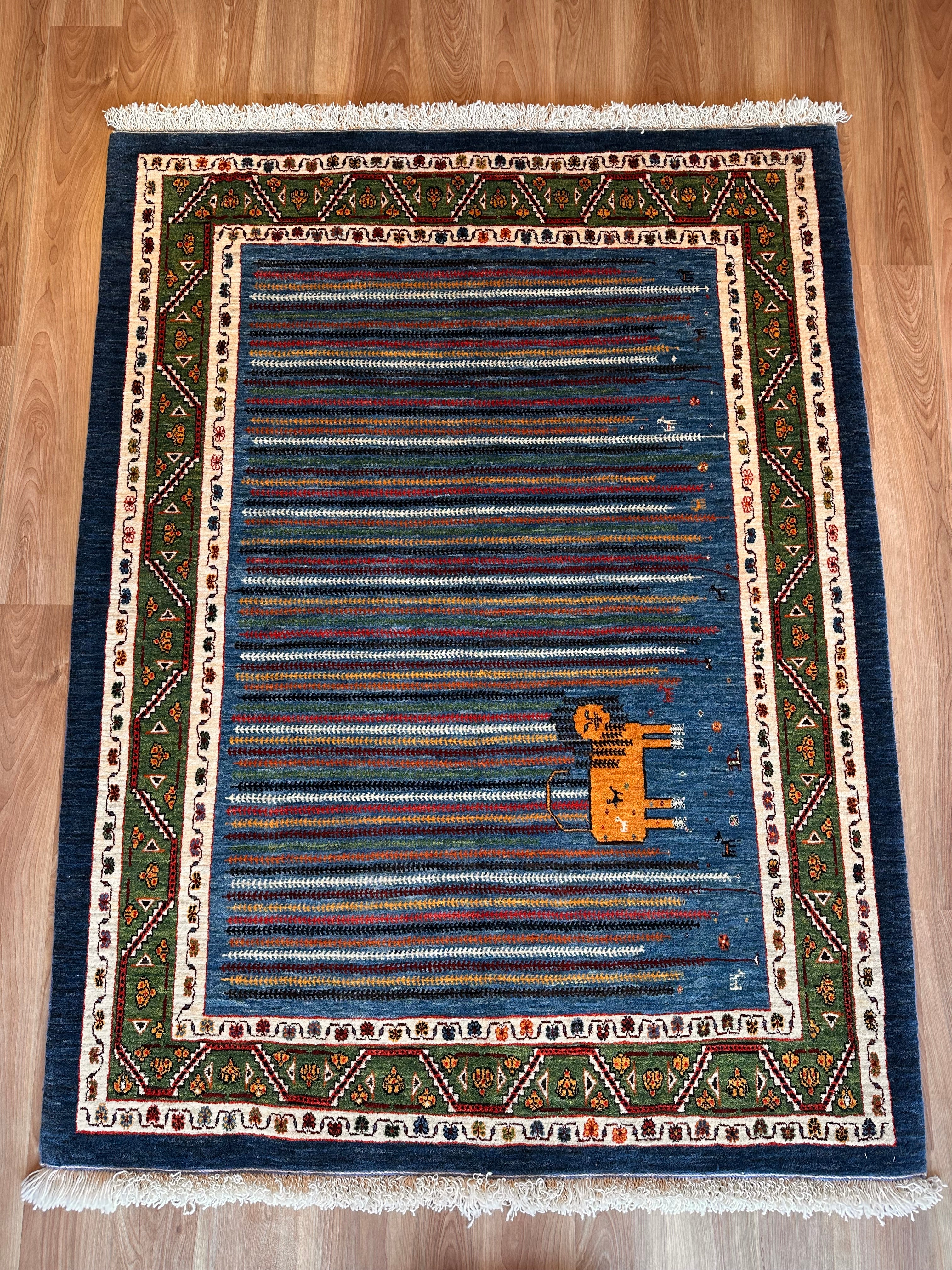 エクセレントギャッベ 198×148cm 手織り青 緑ライオン(GE-0366)