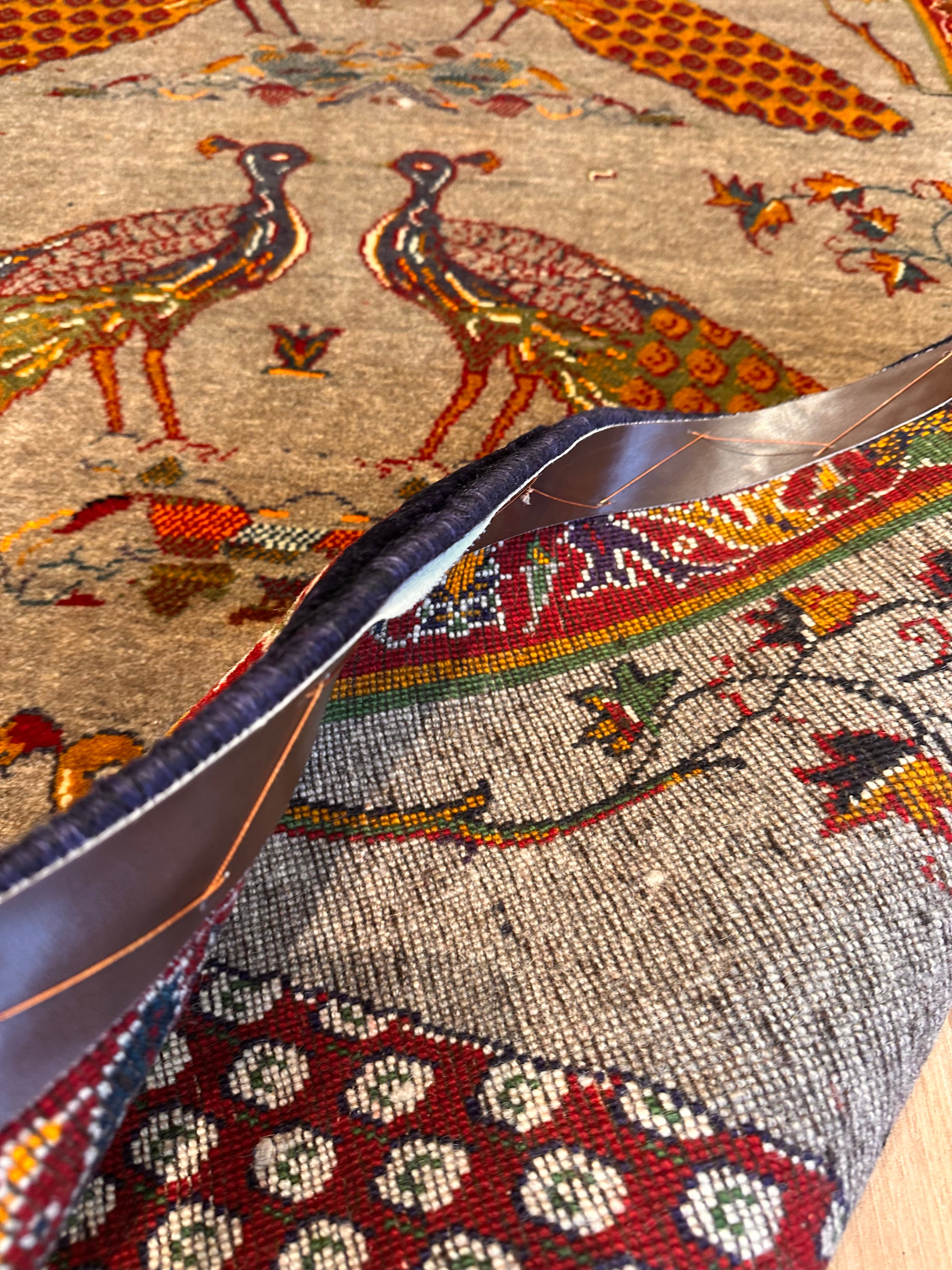 製品への拘り: 当社の絨毯,ギャッベ.ラグには絨毯でいたみやすい箇所にレザーを縫っております。滑り止め、反り返し、歪み、手巻きほどけ防止のために、永くご愛用頂くためにひと手間加えております。