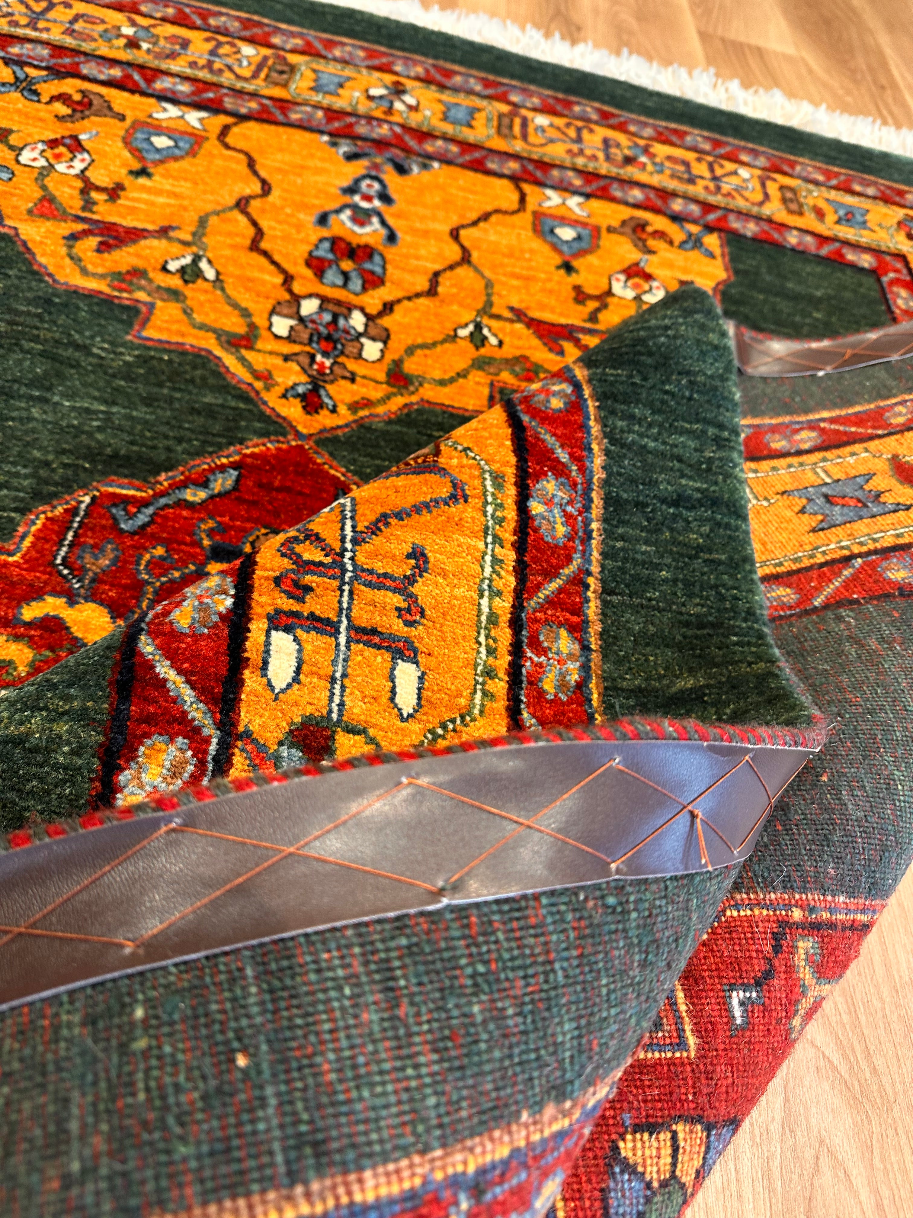 製品への拘り: 当社の絨毯,ギャッベ.ラグには絨毯でいたみやすい箇所にレザーを縫っております。滑り止め、反り返し、歪み、手巻きほどけ防止のために、永くご愛用頂くためにひと手間加えております。
