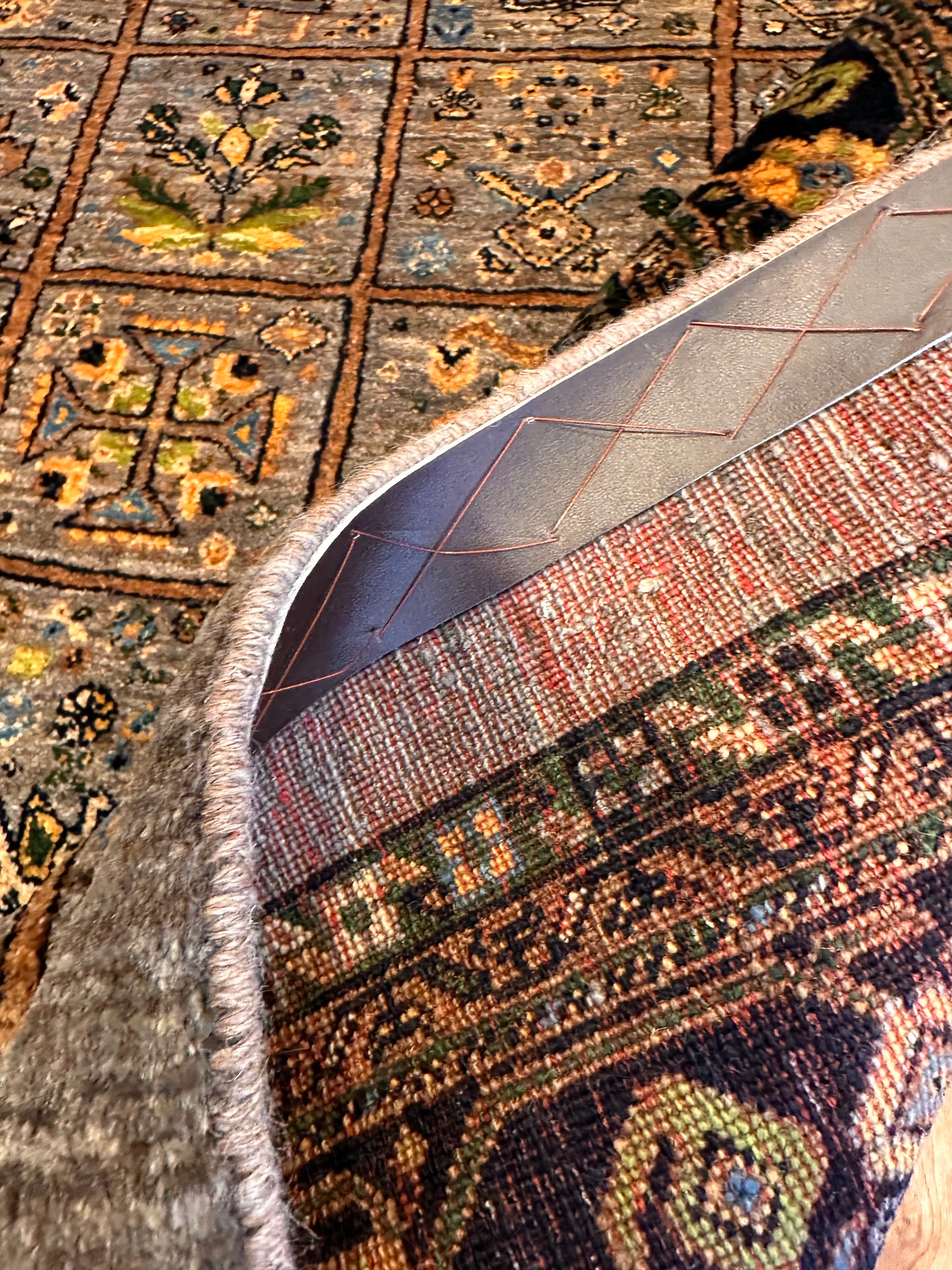 製品への拘り: 当社の絨毯,ギャッベ.ラグには絨毯でいたみやすい箇所にレザーを縫っております。滑り止め、反り返し、歪み、手巻きほどけ防止のために、永くご愛用頂くためにひと手間加えております。
