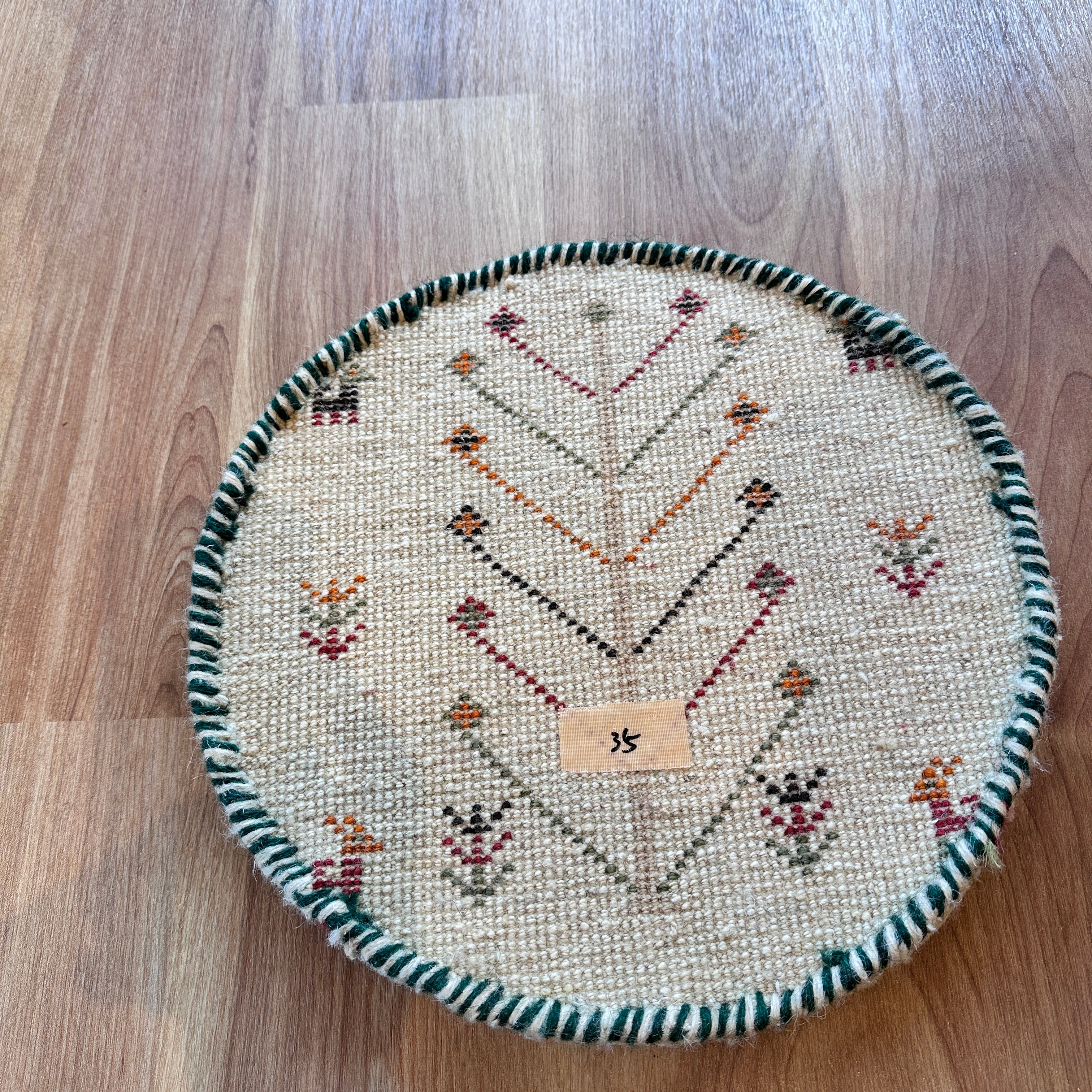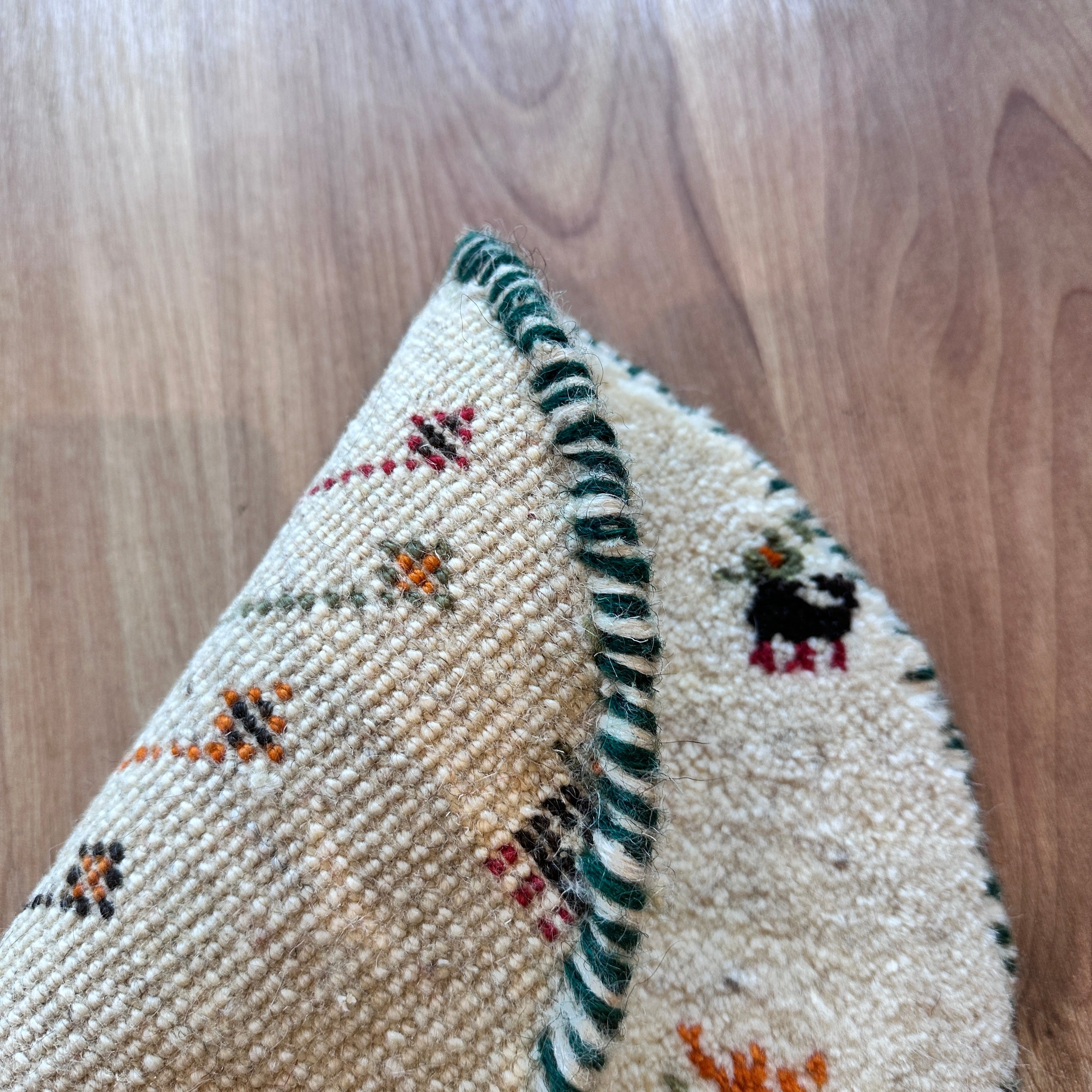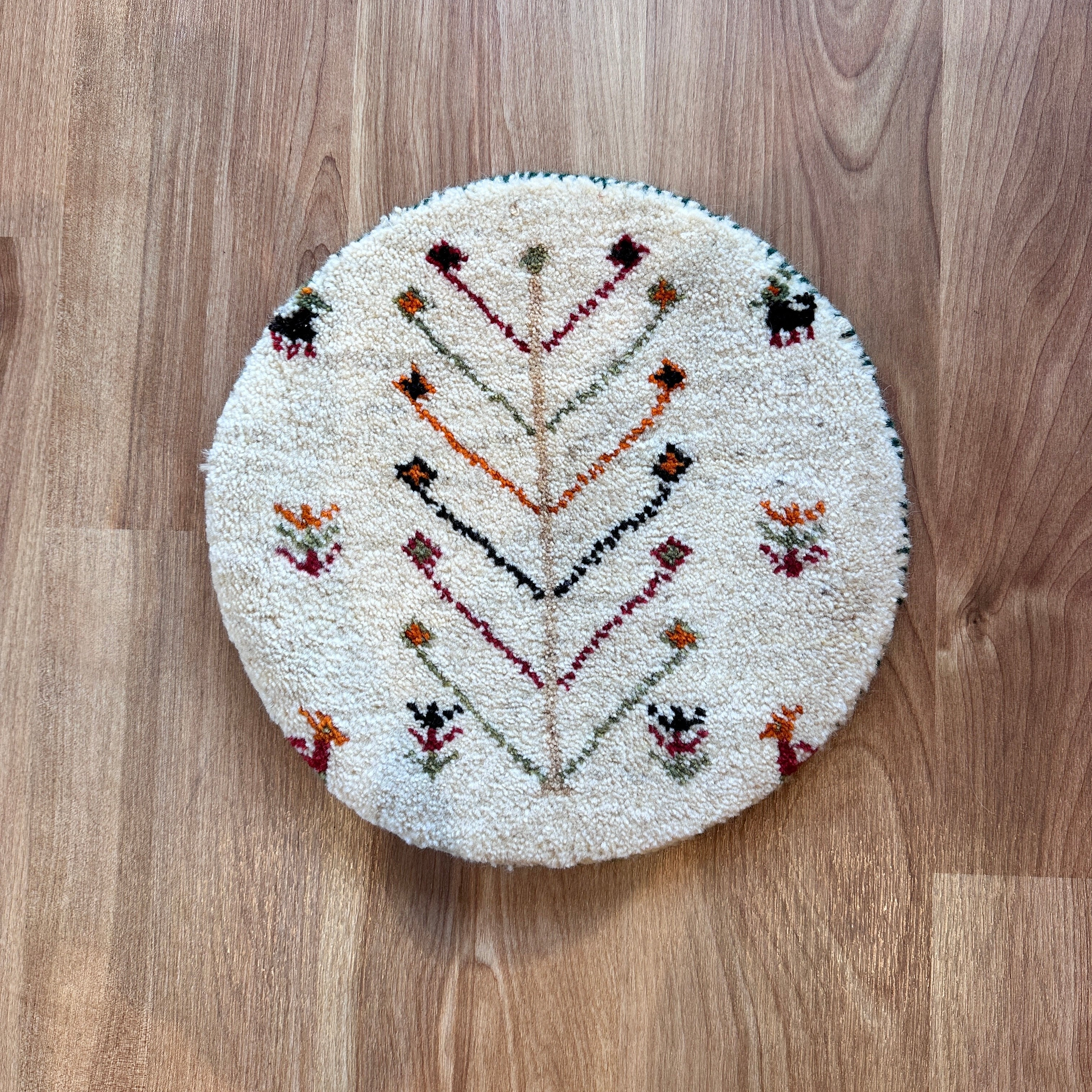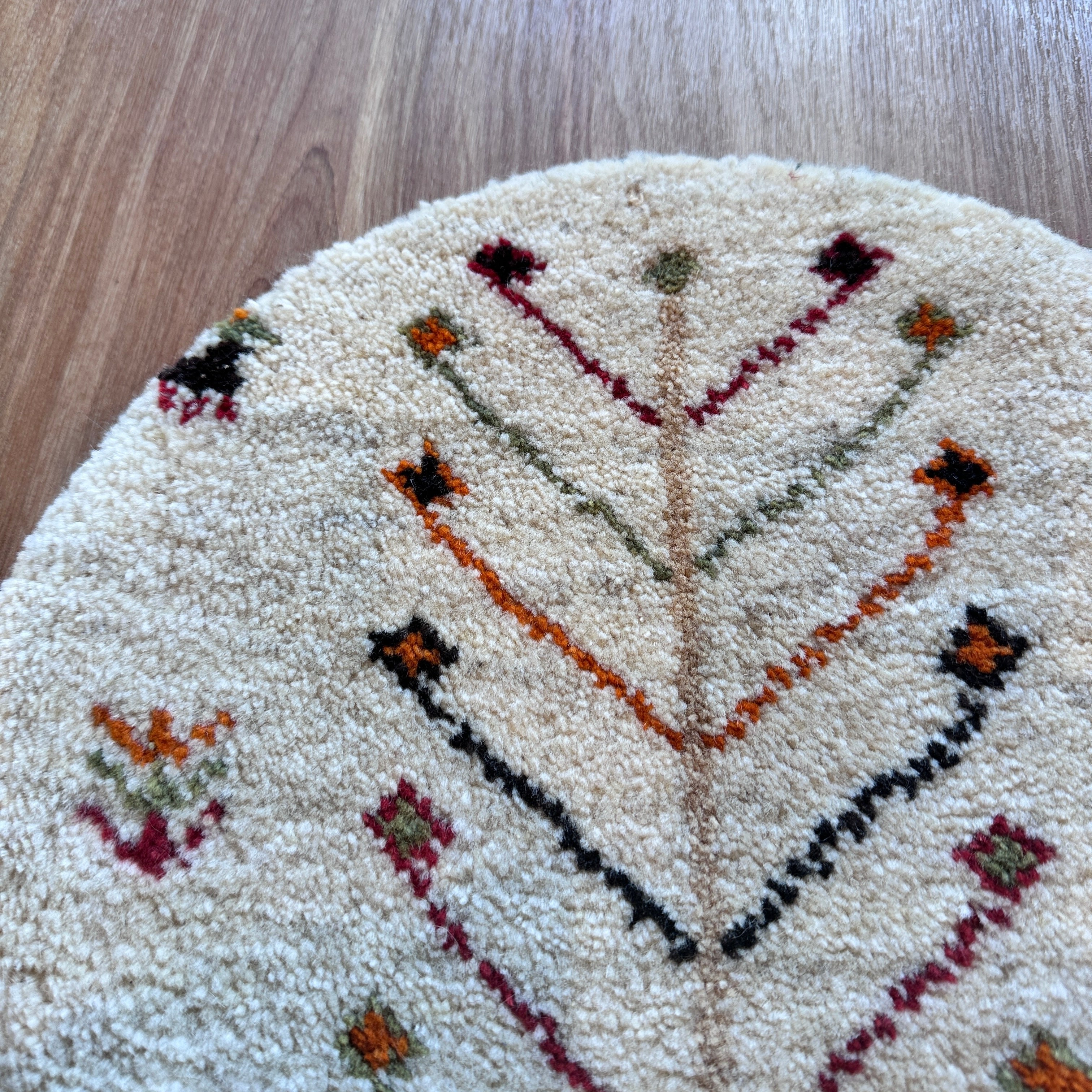 イラン シーラーズ州で織られたギャッベです。遊牧民のアイデンティティーから願いや祈りが生かされ、モチーフをバランスよく配置した円形の座布団サイズです。サイズや厚みなどにバラツキがあるのは手織りの一点もの!ギュッと目が詰まって細かなで手織りのギャッベ