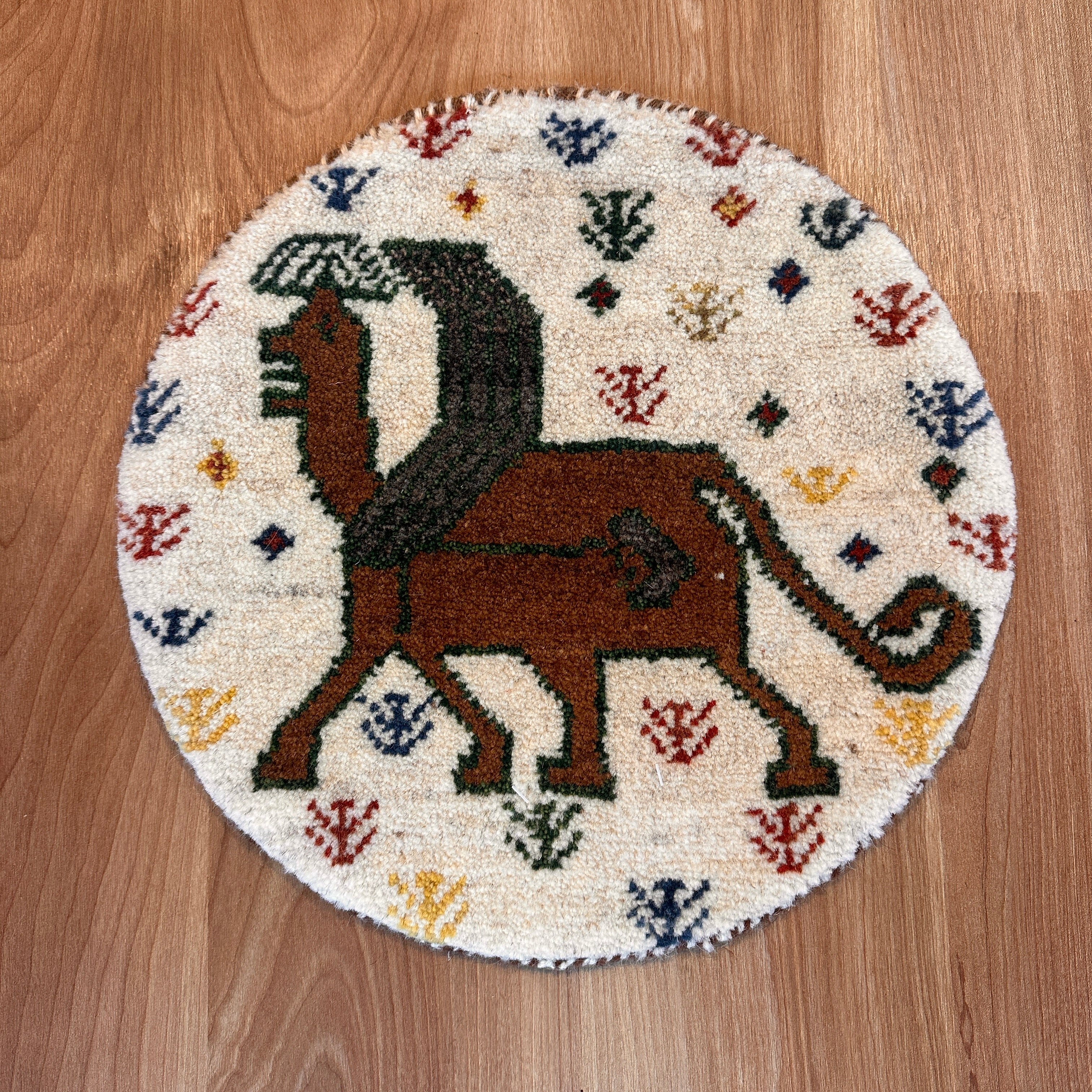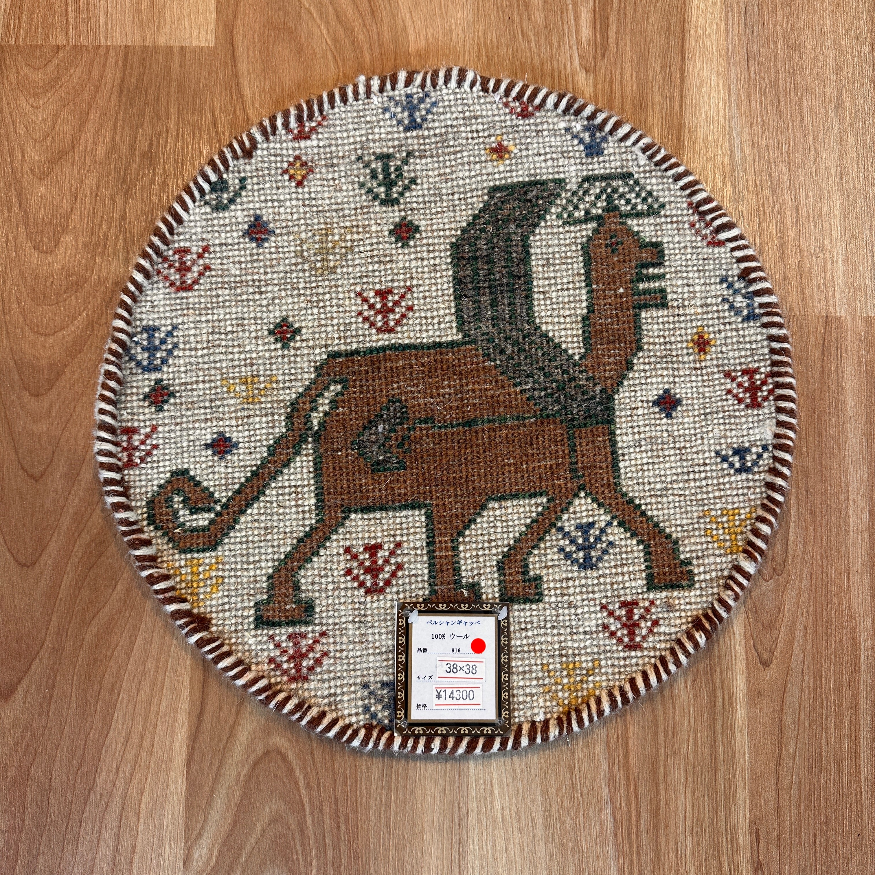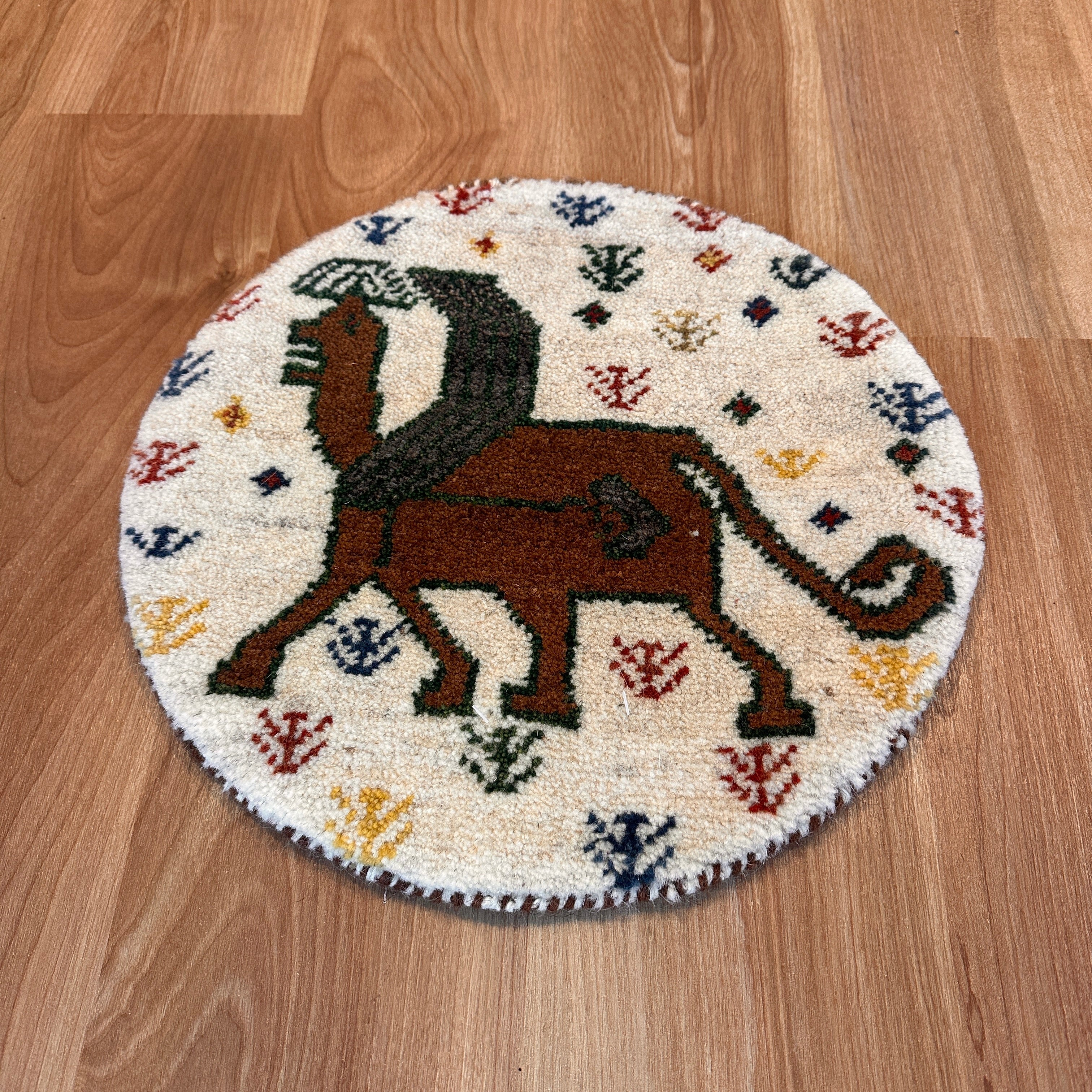 レア柄 ギャッベ 円形 座布団サイズ38cm ライオン 白 手織り(GCR-5417)