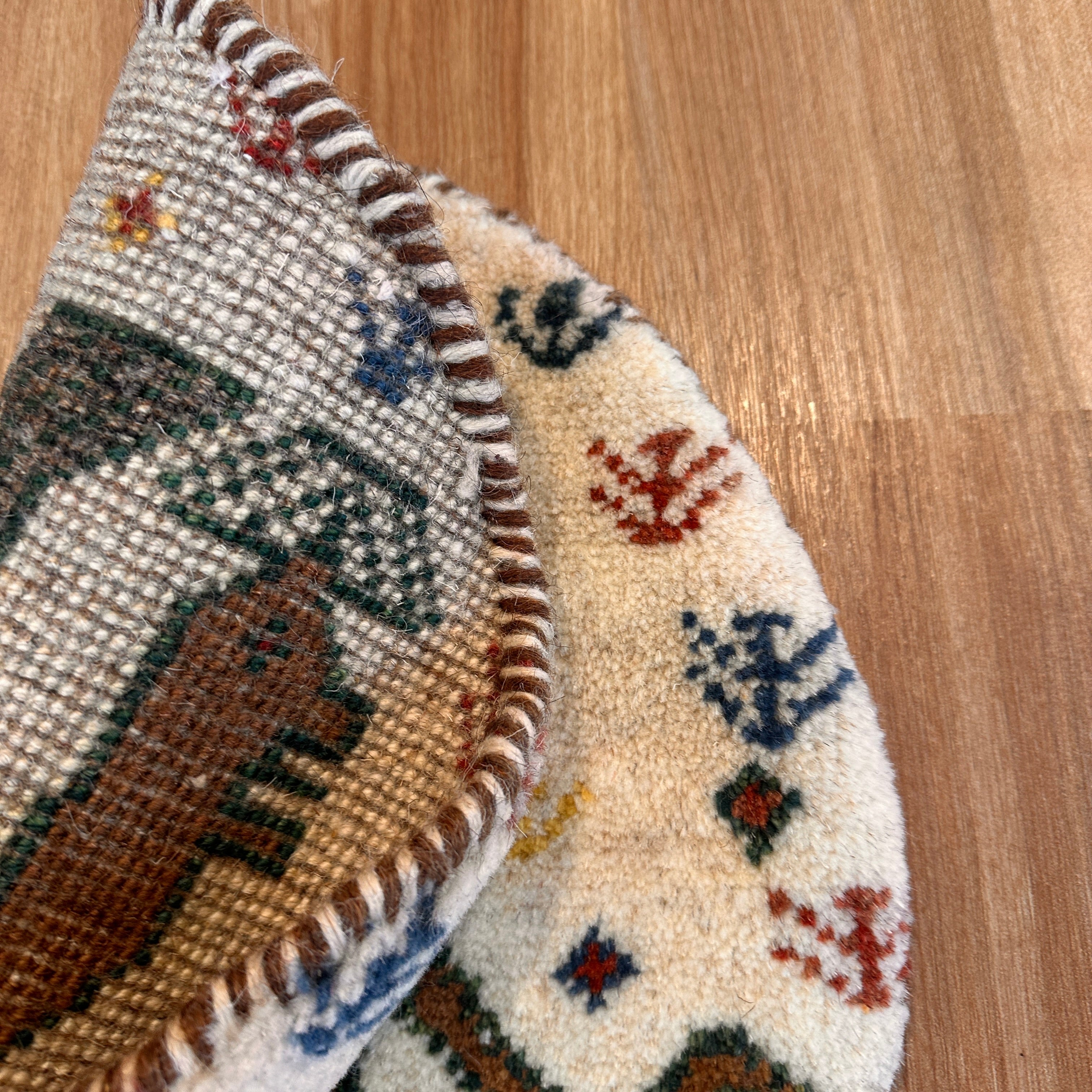 イラン シーラーズ州で織られたギャッベです。遊牧民のアイデンティティーから願いや祈りが生かされ、モチーフをバランスよく配置した円形の座布団サイズです。サイズや厚みなどにバラツキがあるのは手織りの一点もの!ギュッと目が詰まって細かなで手織りのギャッベ