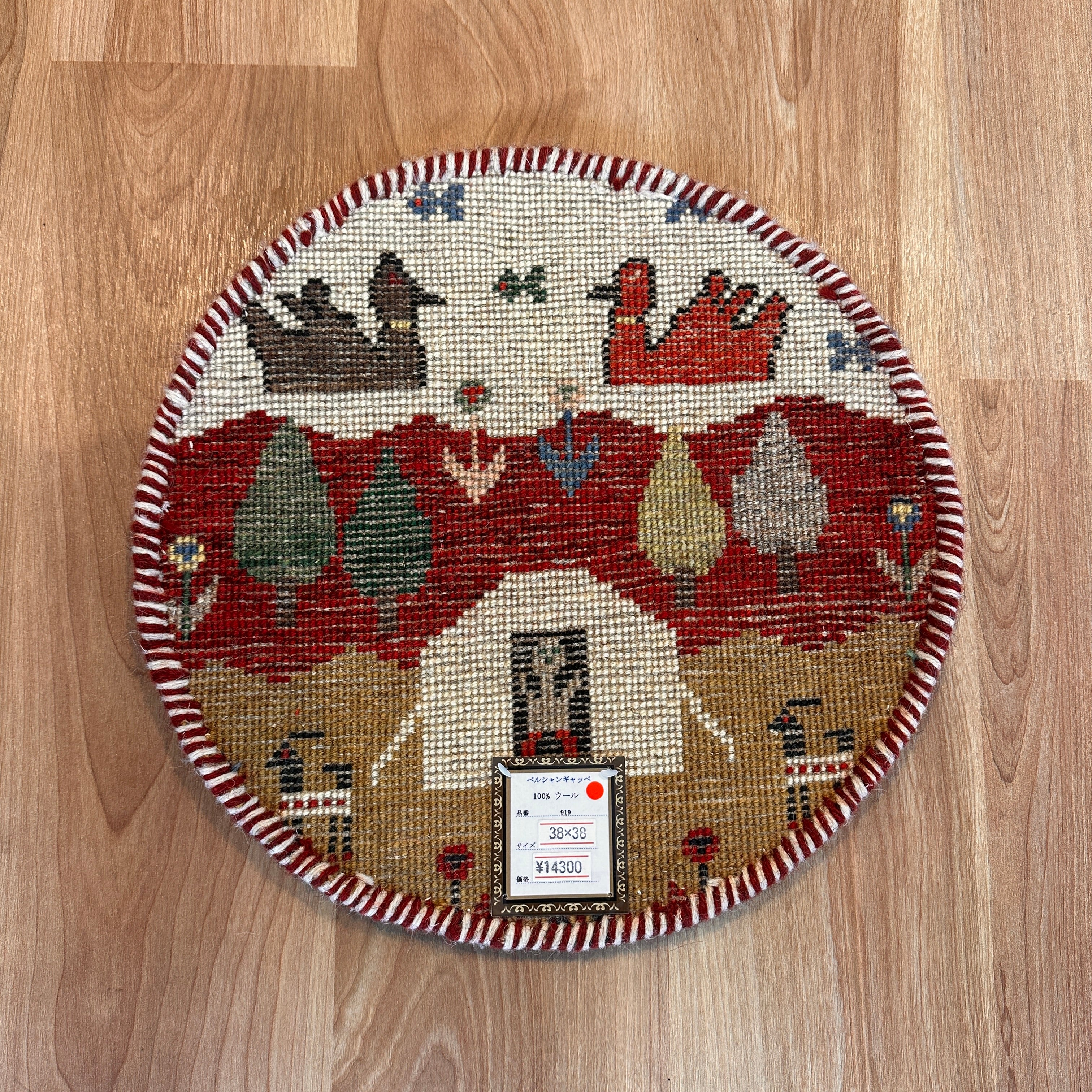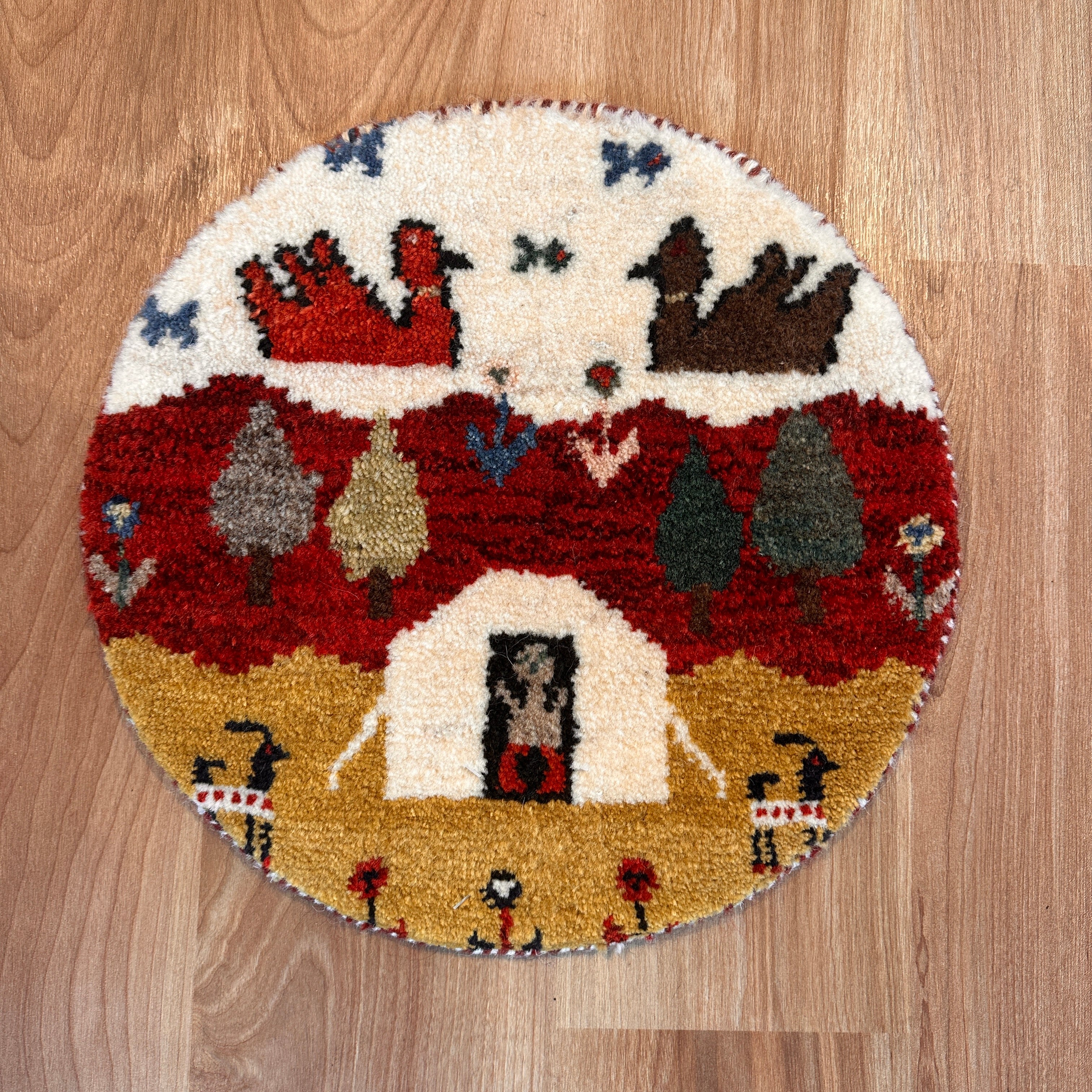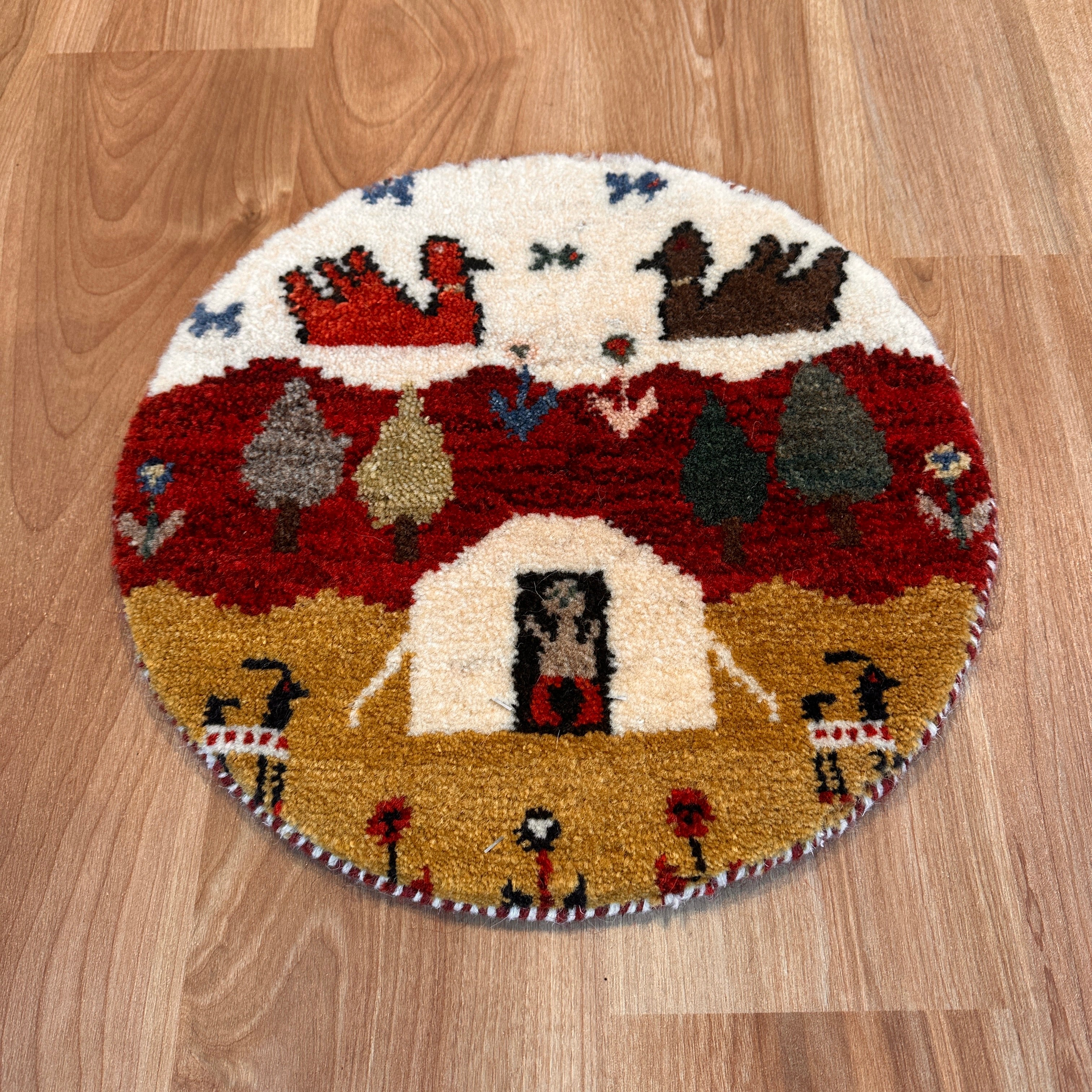 レア柄 ギャッベ 円形 座布団サイズ38cm 生命の樹 鳥 人 手織り(GCR-5419)