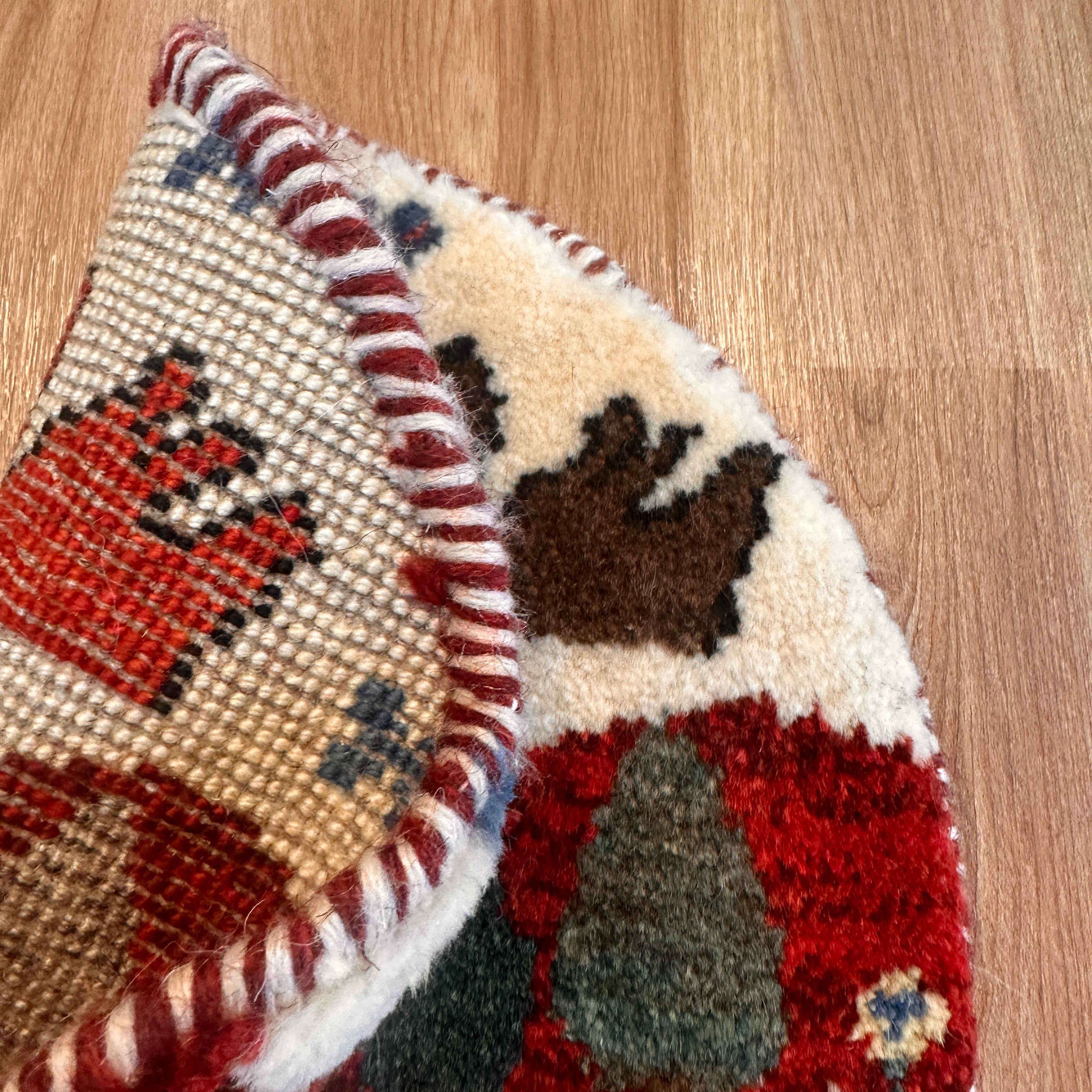 イラン シーラーズ州で織られたギャッベです。遊牧民のアイデンティティーから願いや祈りが生かされ、モチーフをバランスよく配置した円形の座布団サイズです。サイズや厚みなどにバラツキがあるのは手織りの一点もの!ギュッと目が詰まって細かなで手織りのギャッベ
