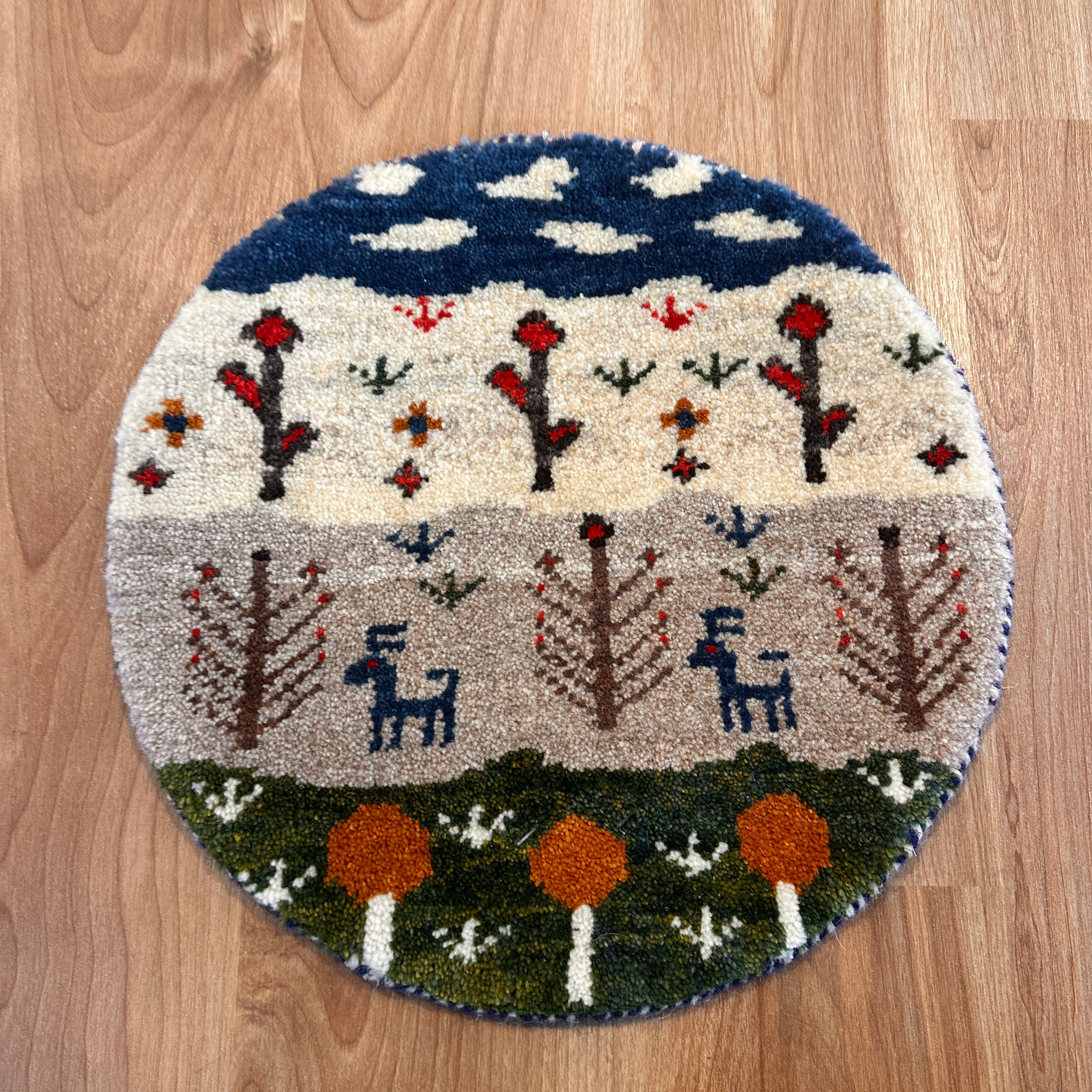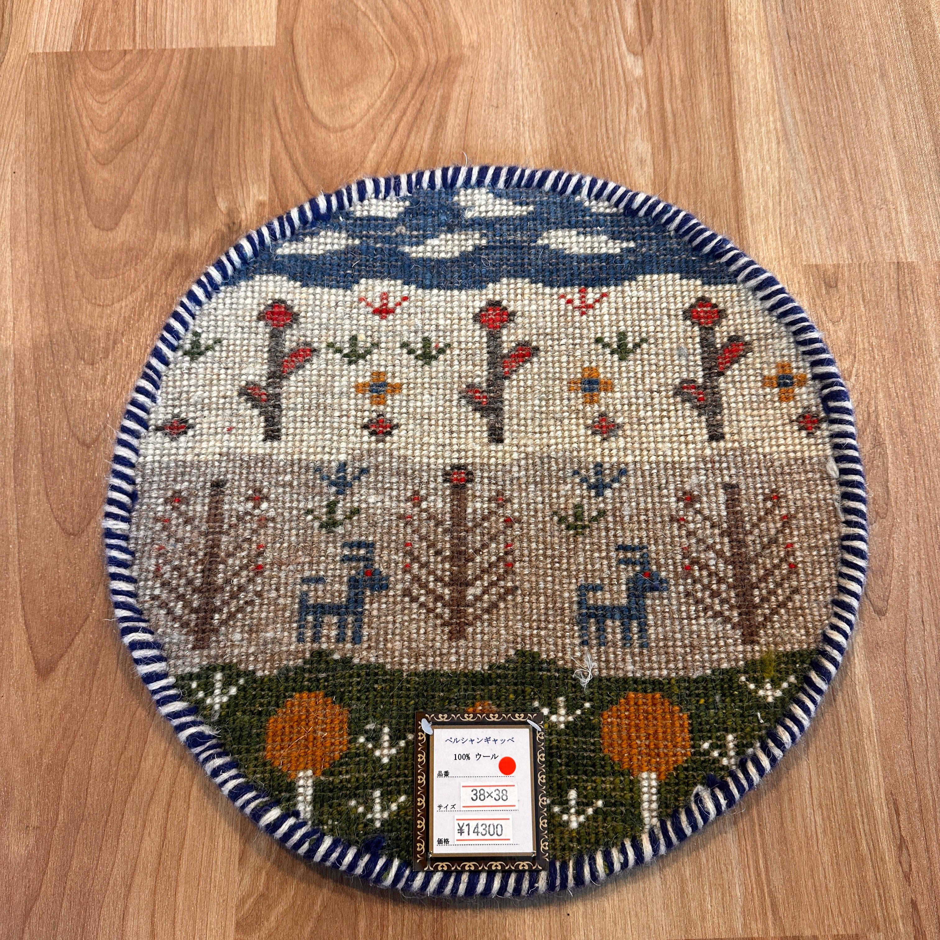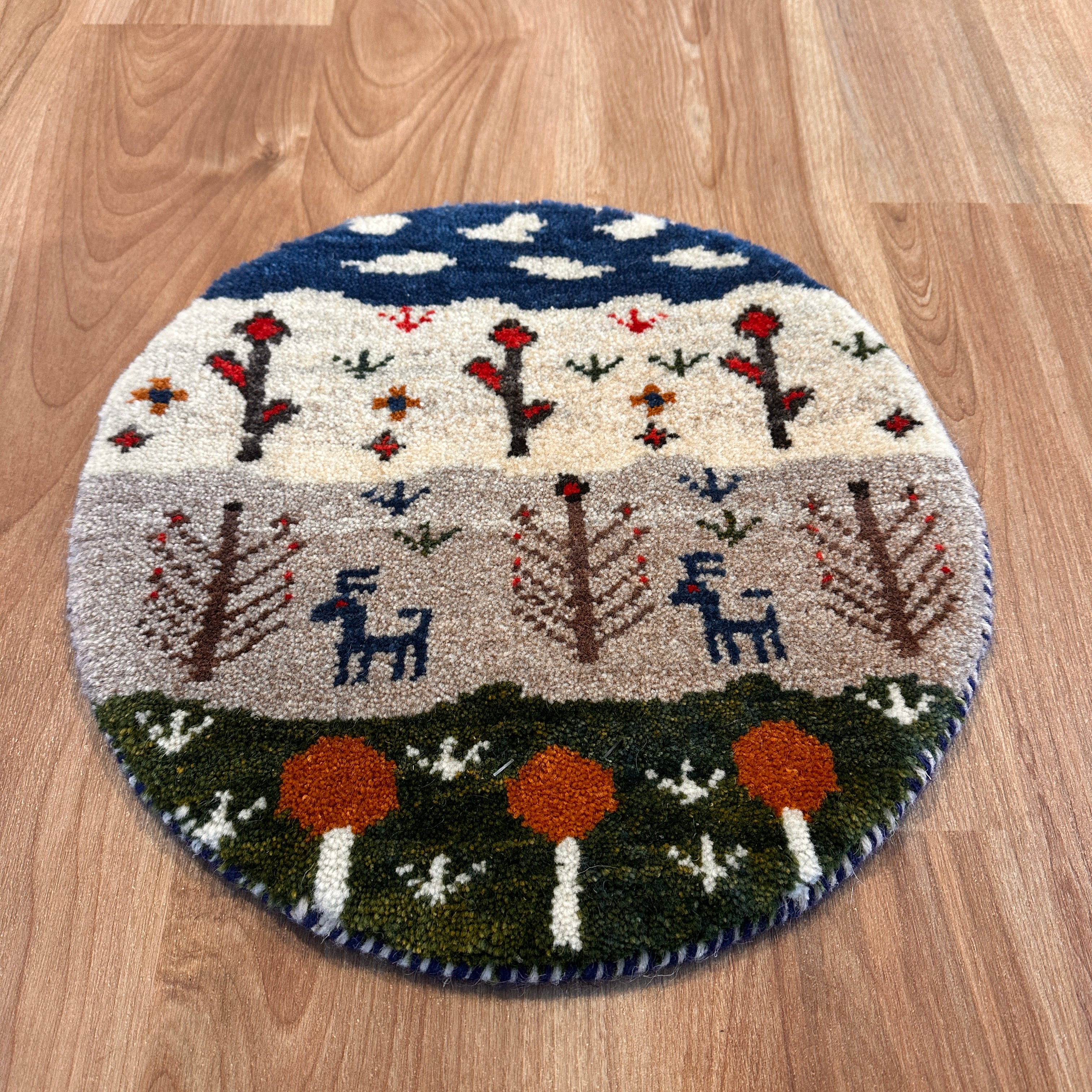 レア柄 ギャッベ 円形 座布団サイズ38cm 花 生命の樹 鹿 手織り(GCR-5424)