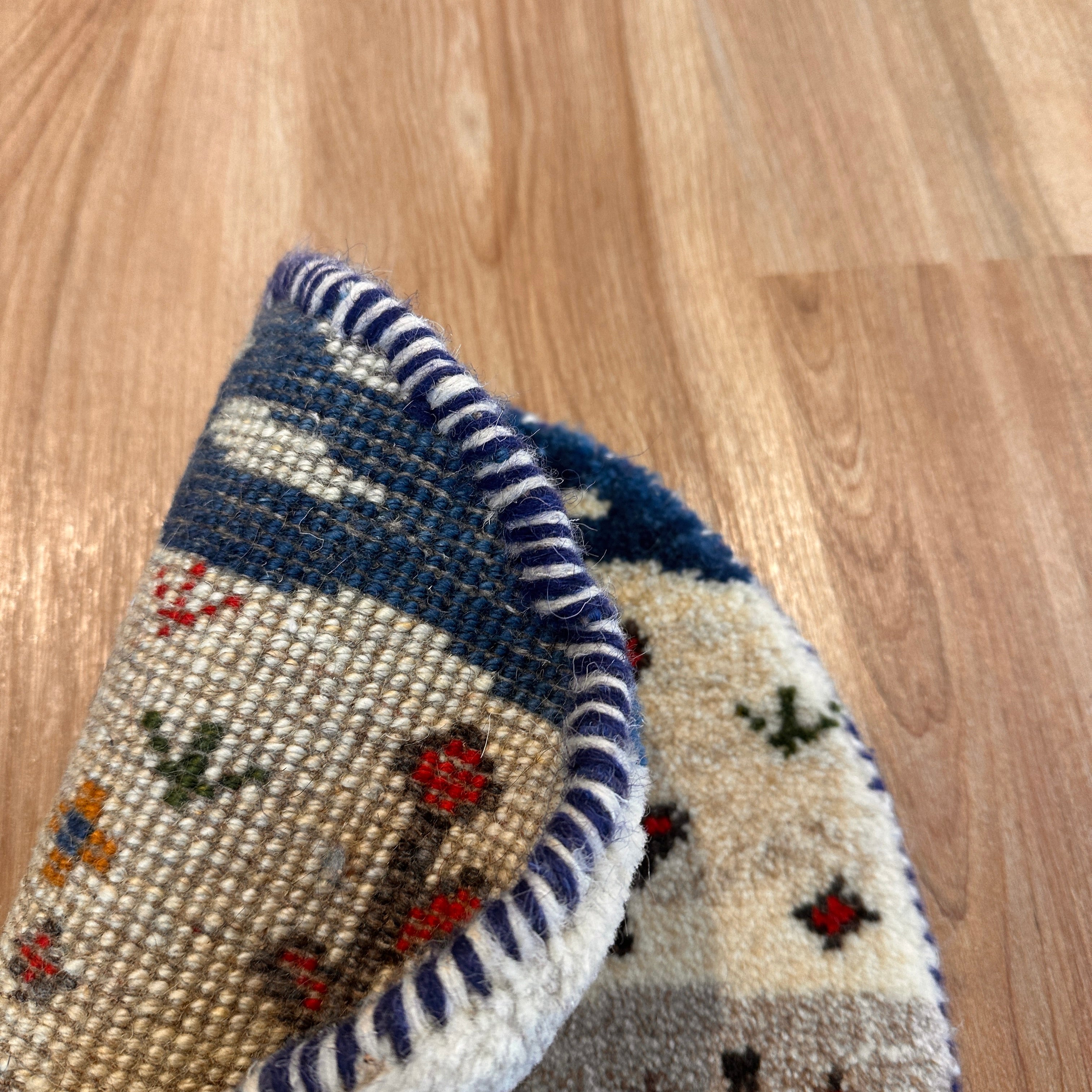 イラン シーラーズ州で織られたギャッベです。遊牧民のアイデンティティーから願いや祈りが生かされ、モチーフをバランスよく配置した円形の座布団サイズです。サイズや厚みなどにバラツキがあるのは手織りの一点もの!ギュッと目が詰まって細かなで手織りのギャッベ