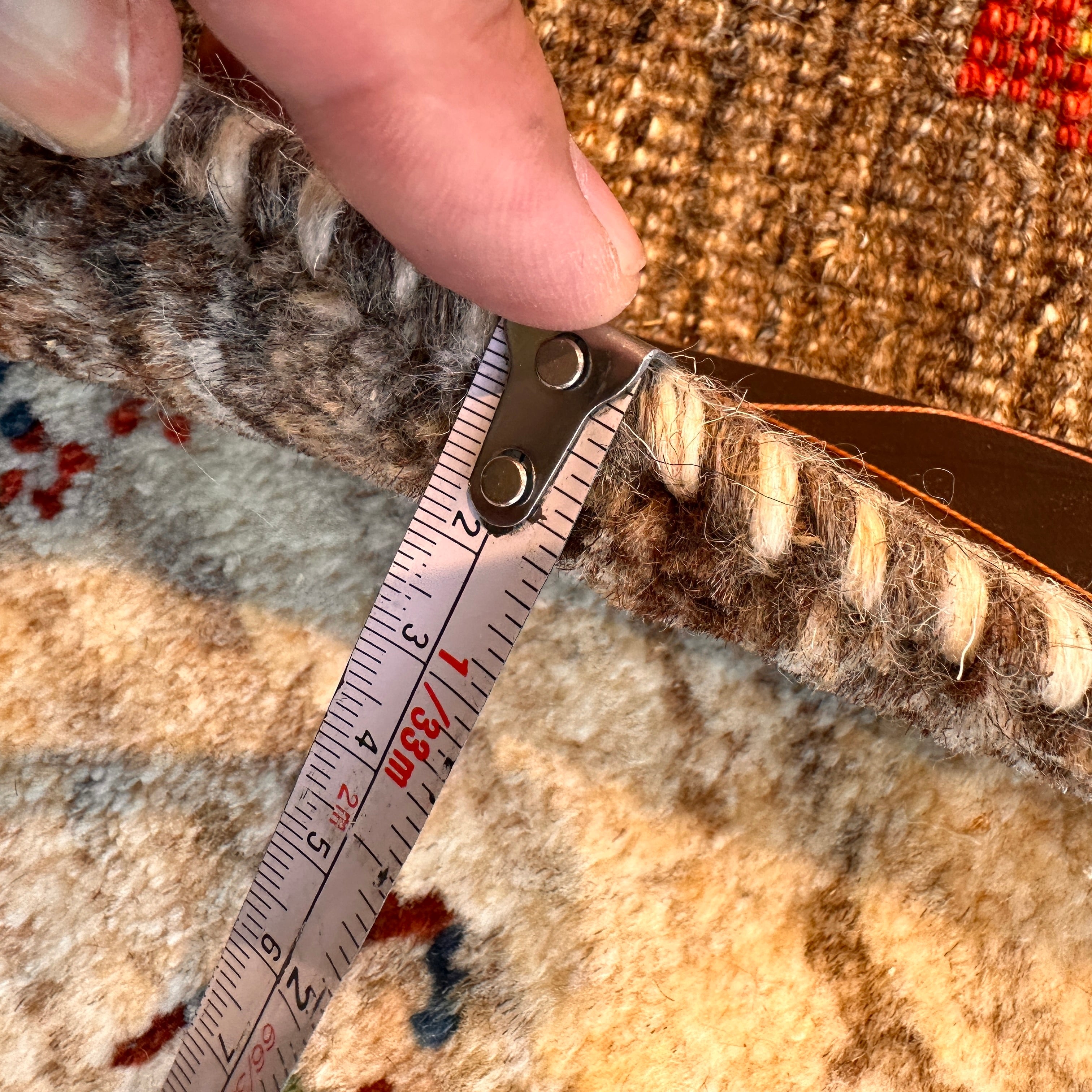 製品への拘り:ひとつひとつを永くご愛用頂くために当社のペルシャン絨毯,ギャッベ,ラグの裏面の両サイドには、反り返し、歪み、手巻きほどけ防止のために、ひと手間加えております