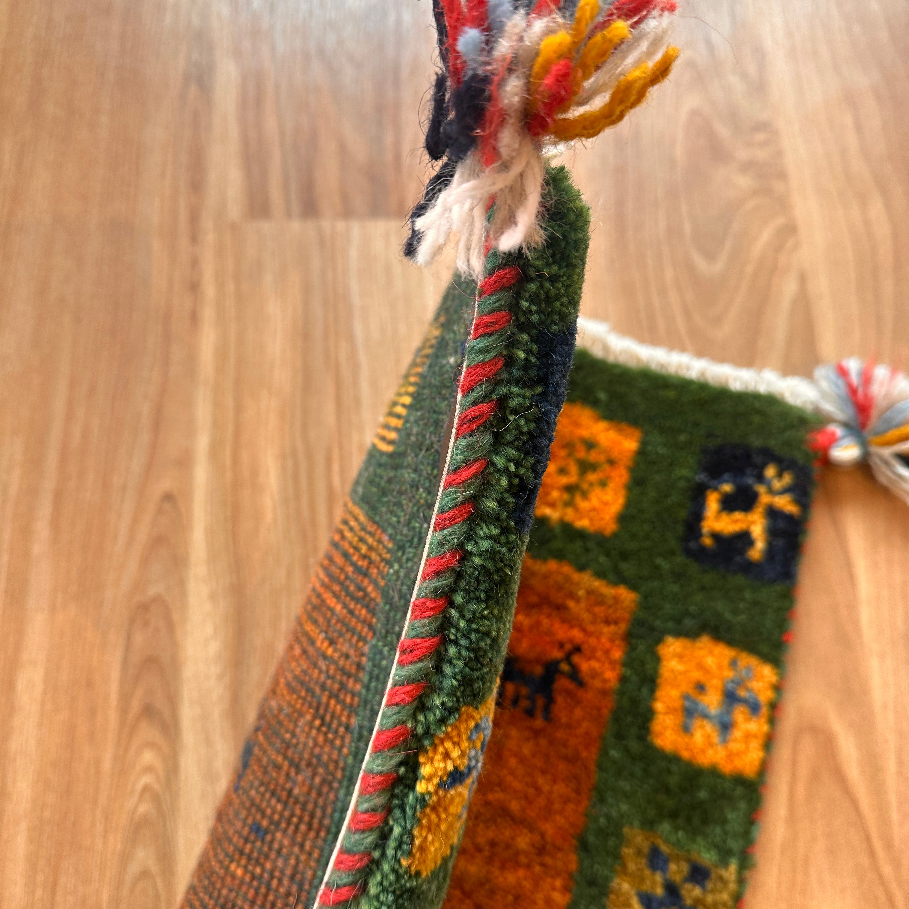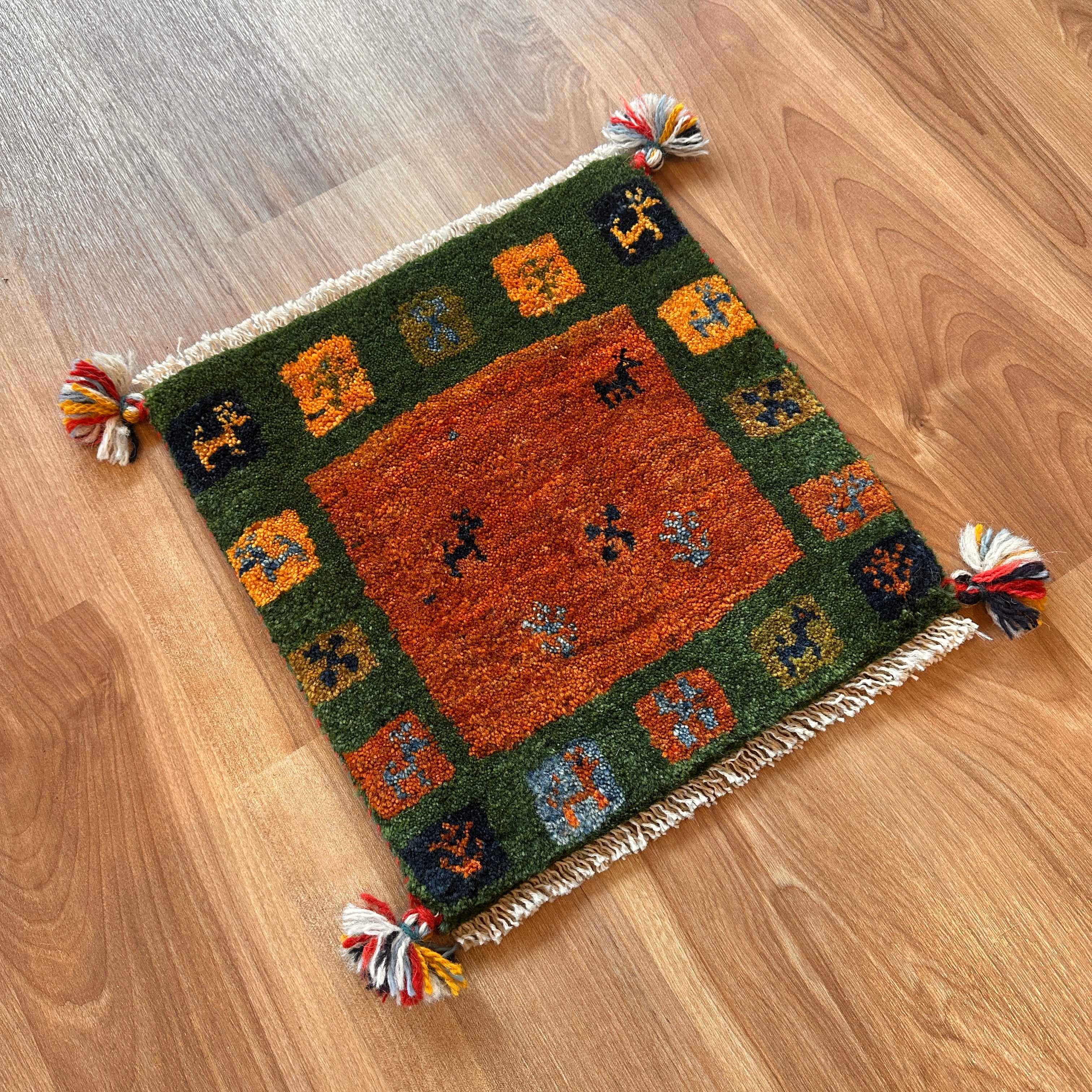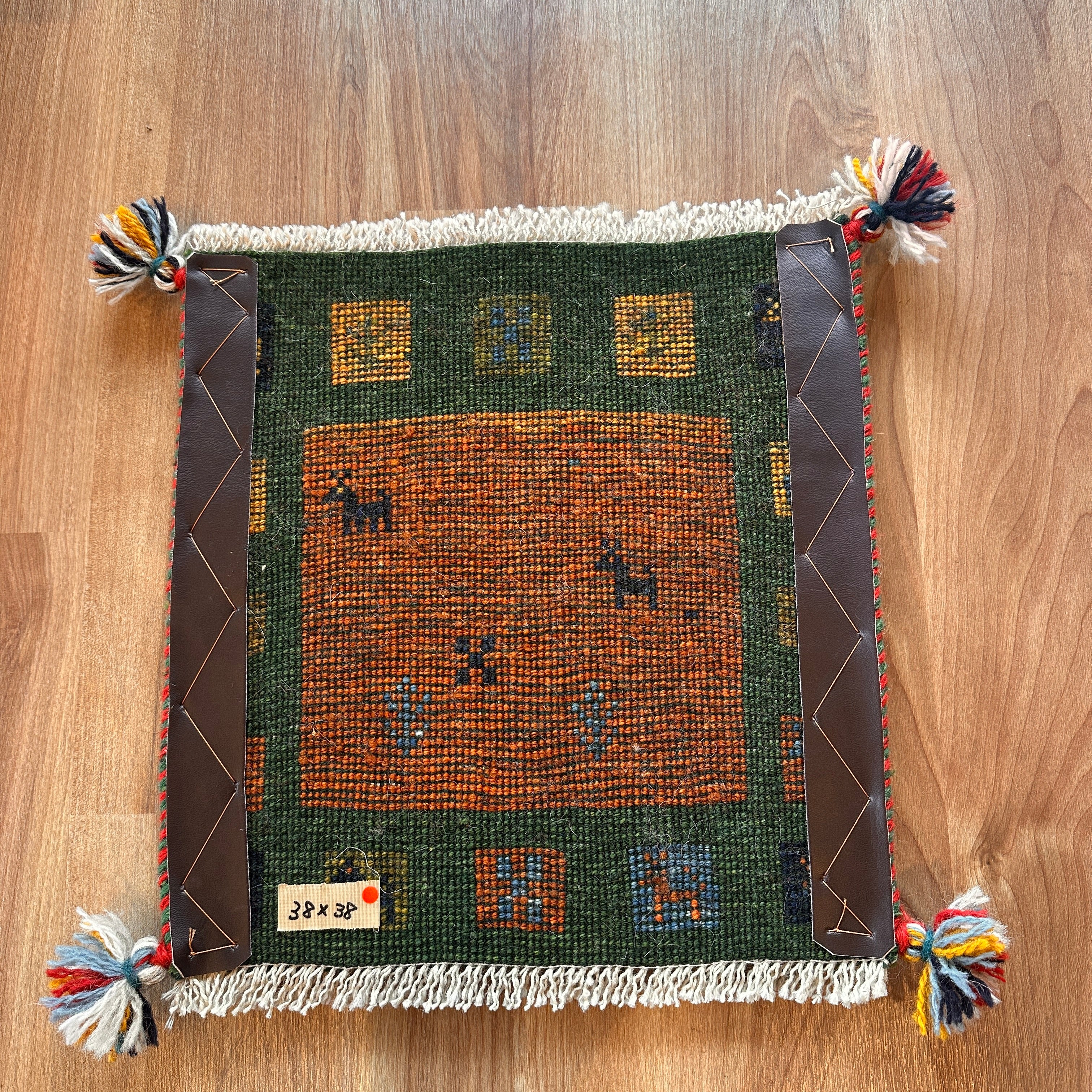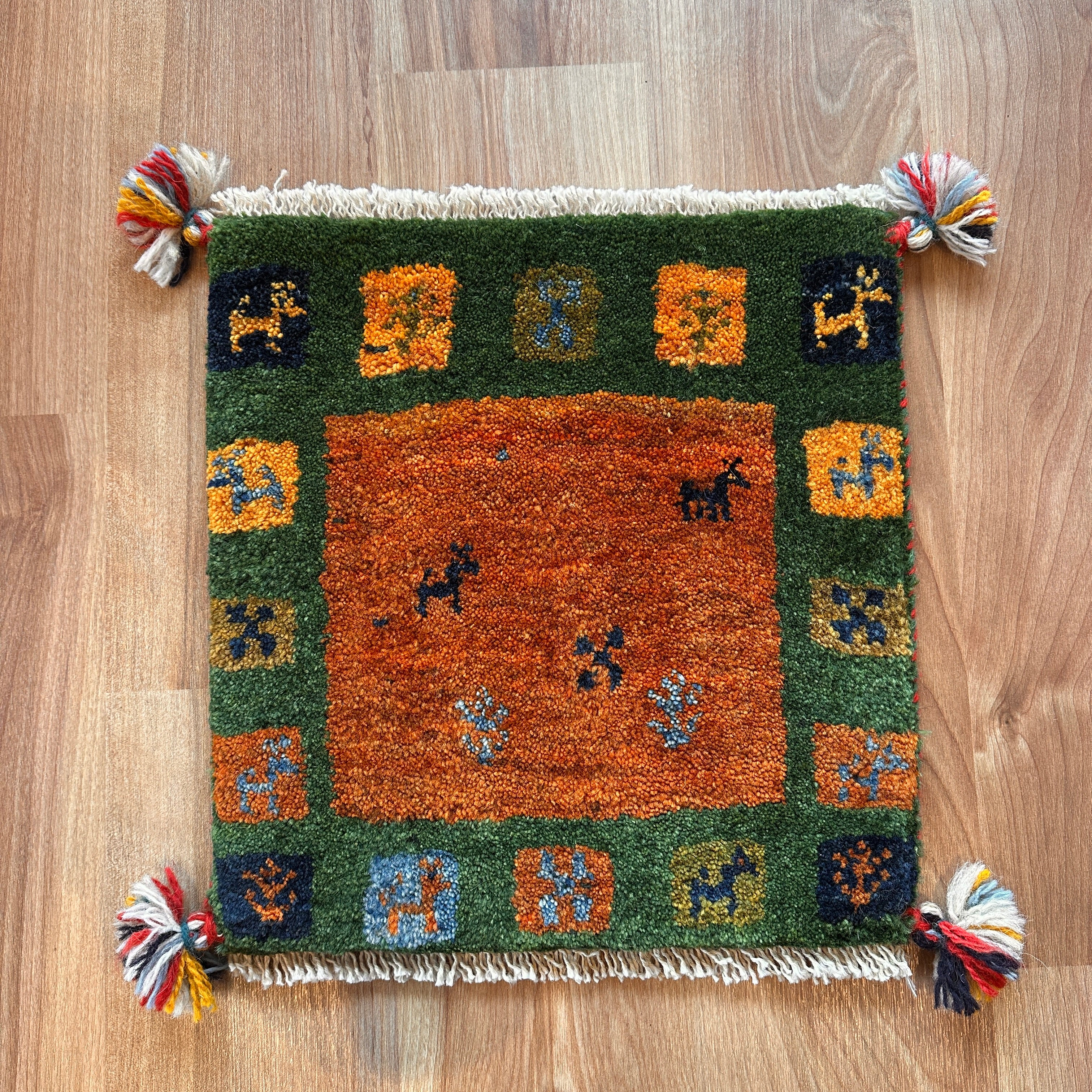 【決算SALE9/13-9/30】ギャッベ 座布団サイズ 38×38cm 手織り生命の樹 鹿 緑(GC-5634)