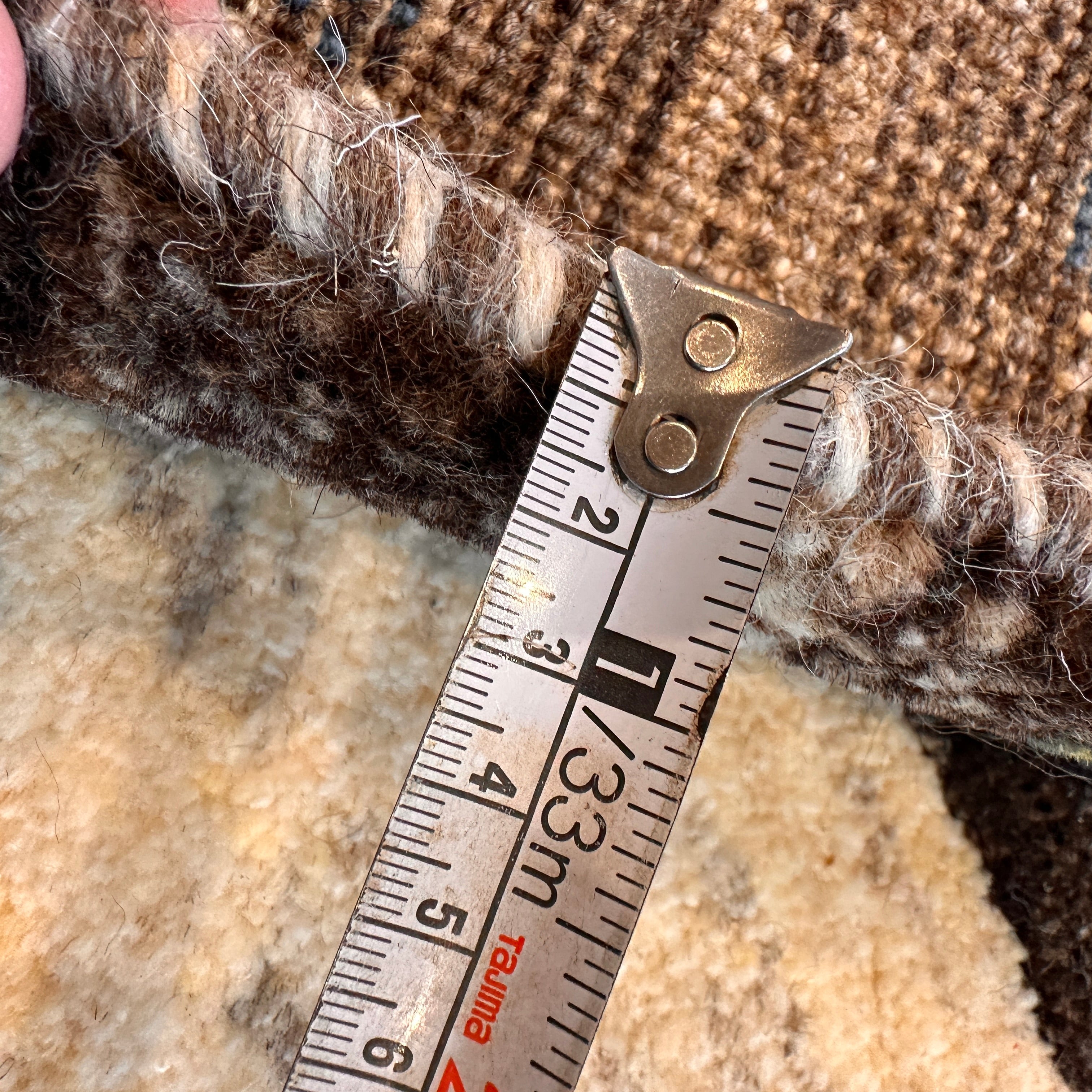 製品への拘り:ひとつひとつを永くご愛用頂くために当社のペルシャン絨毯,ギャッベ,ラグの裏面の両サイドには、反り返し、歪み、手巻きほどけ防止のために、ひと手間加えております