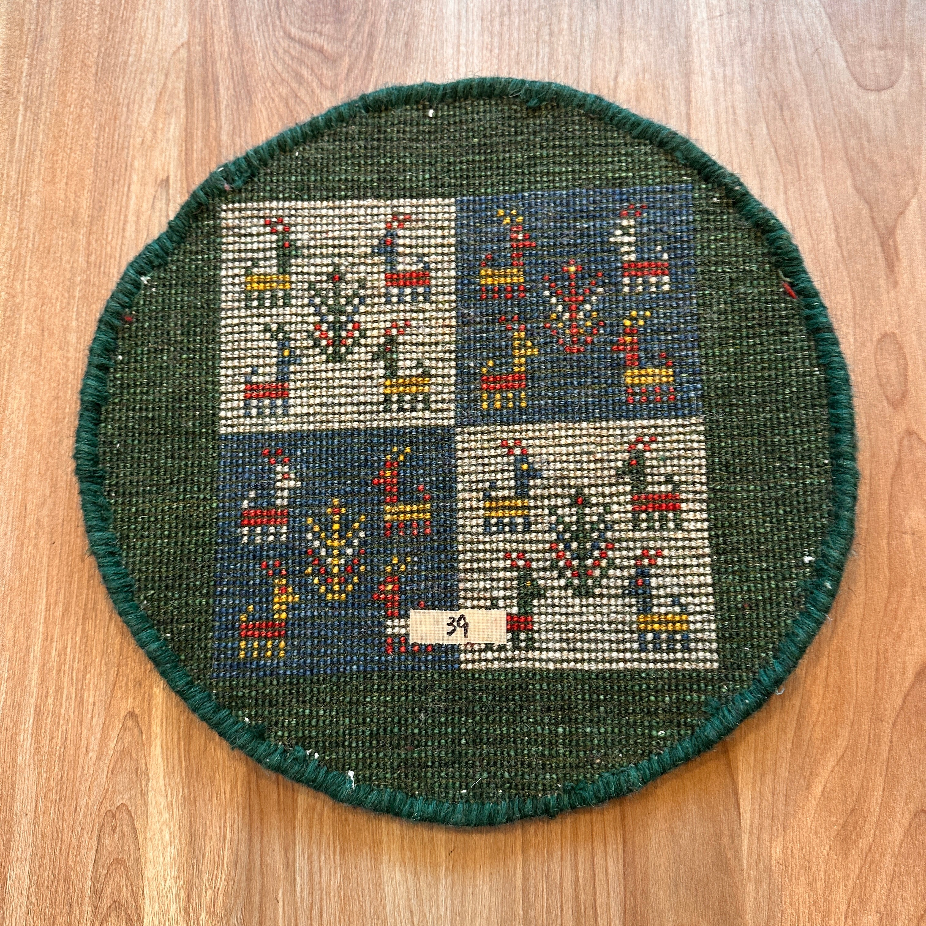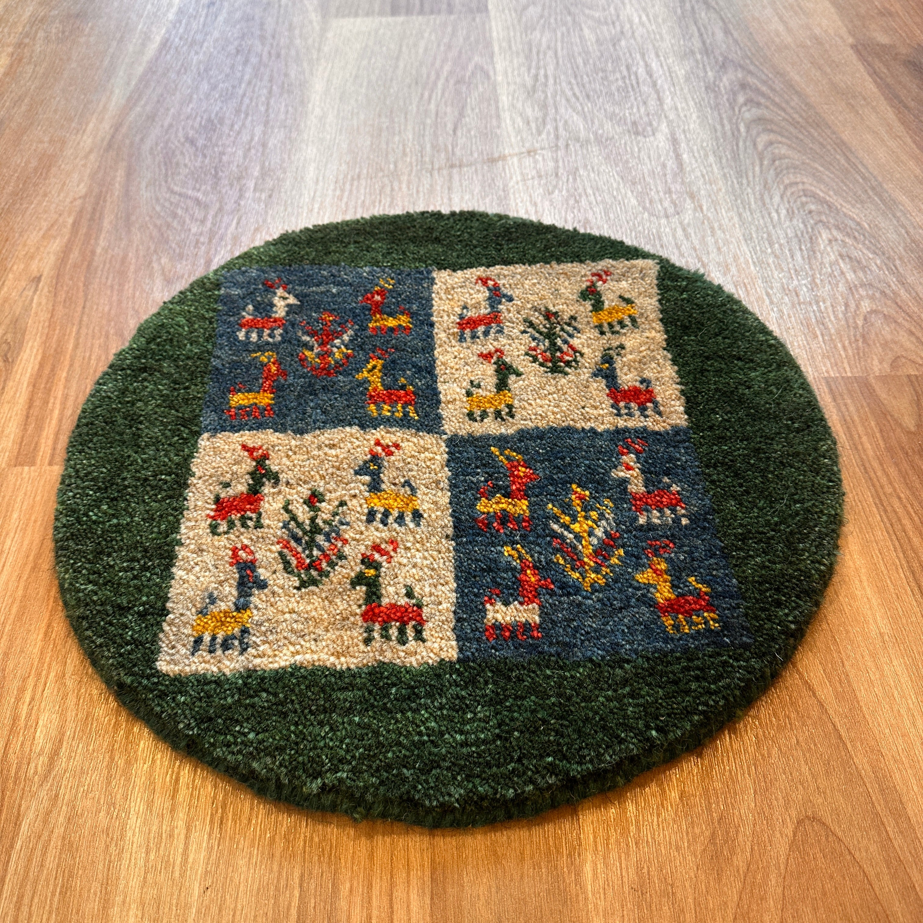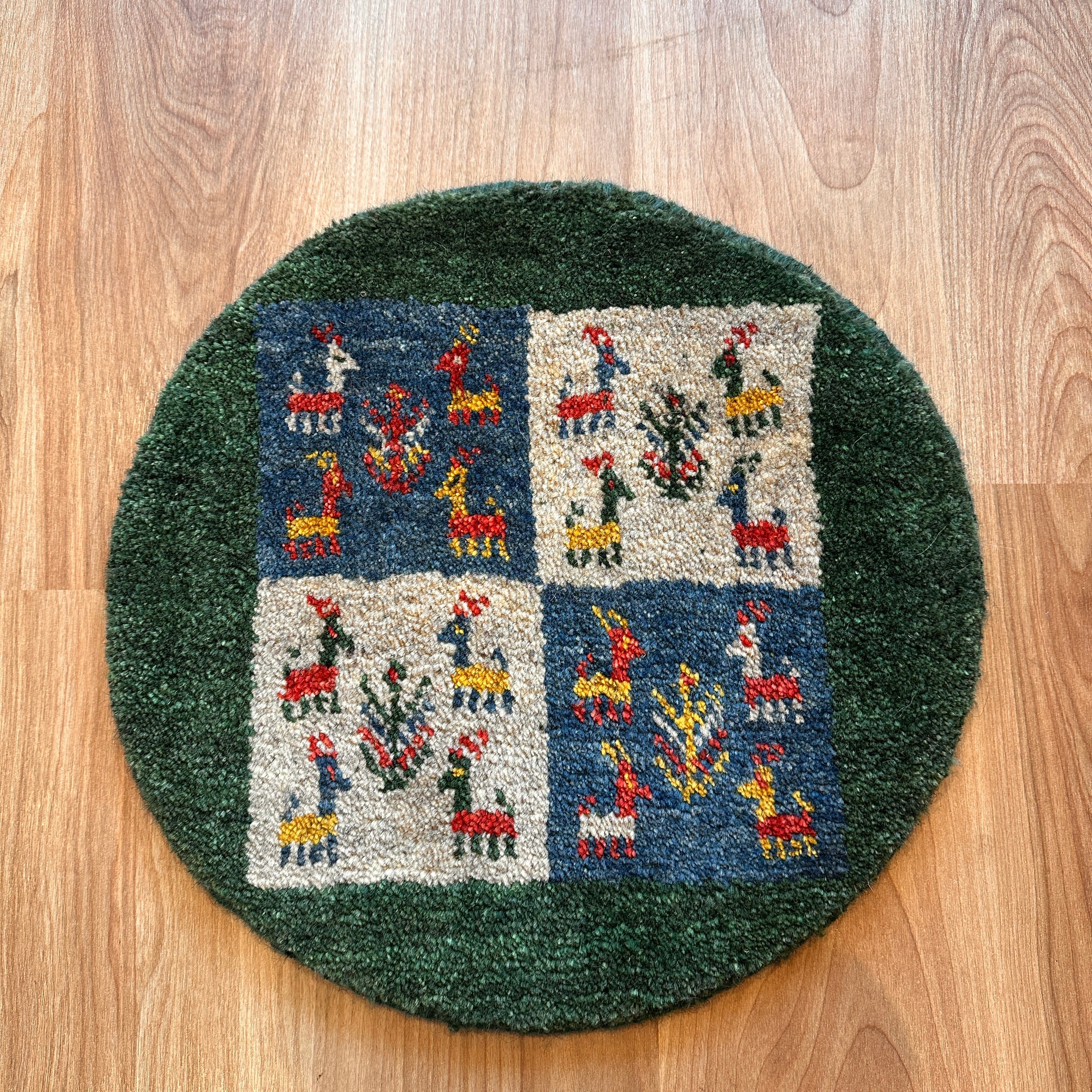 newギャッベ 円形 座布団サイズ39cm 生命の樹 鹿 緑 手織り(GCR-5416)