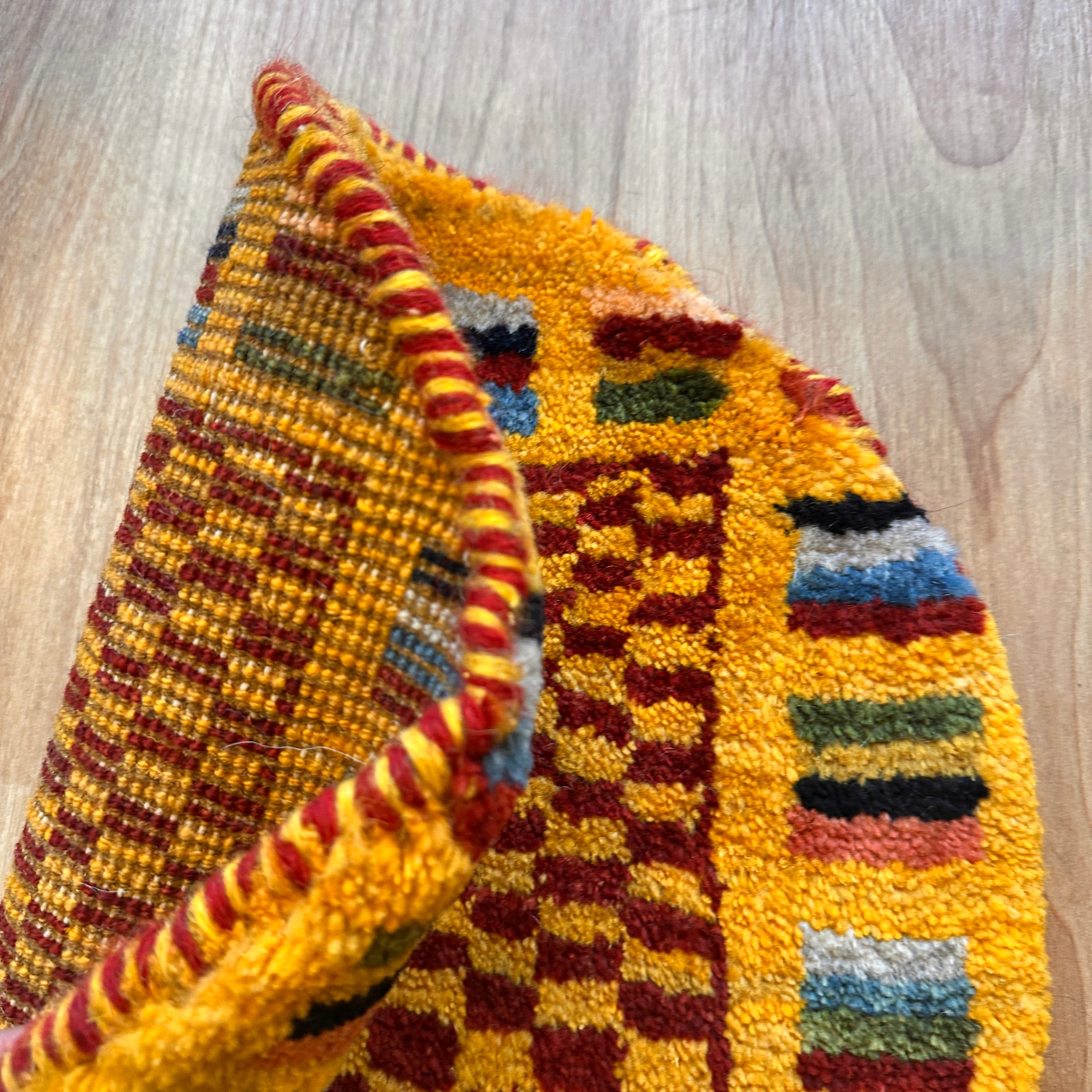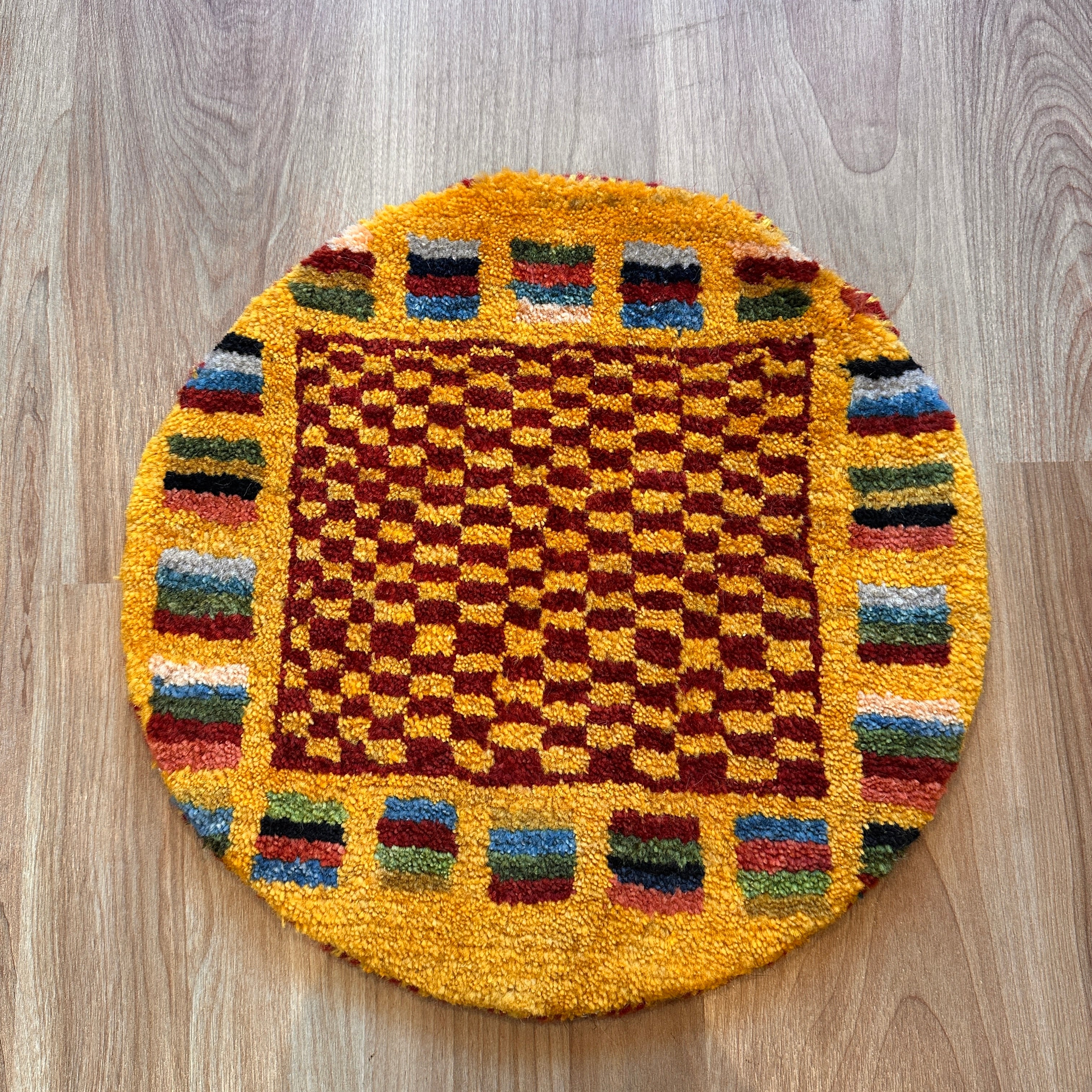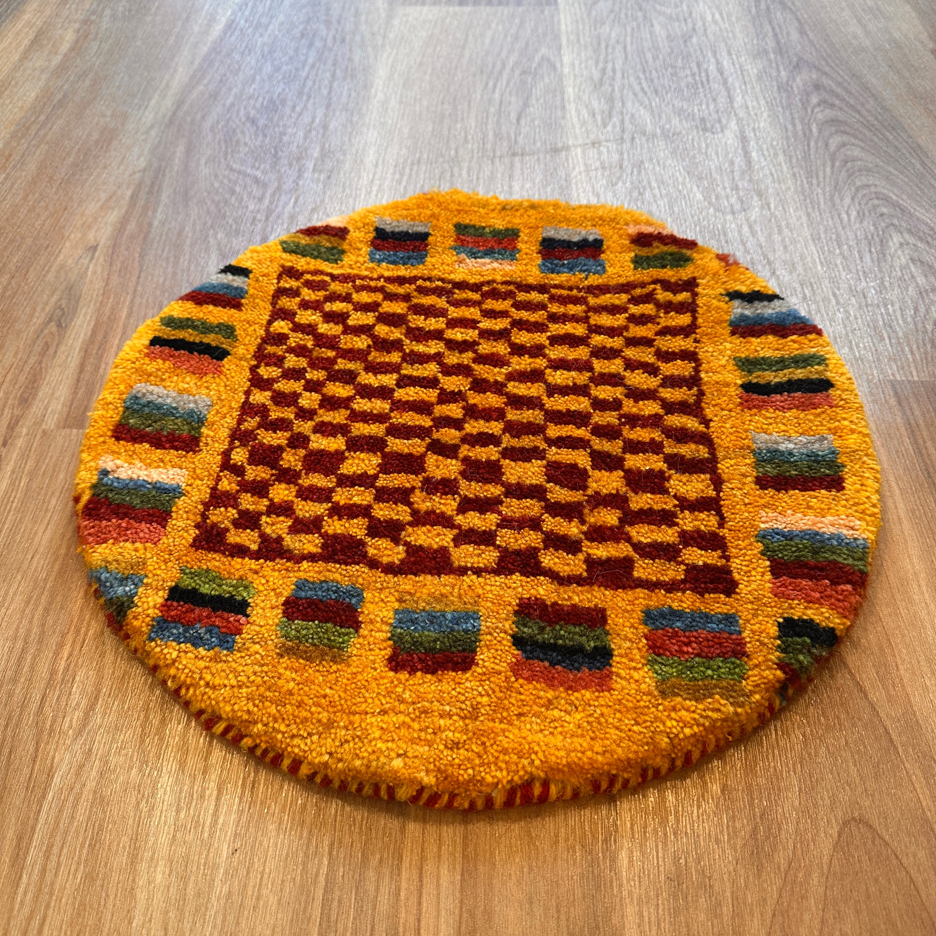 イラン シーラーズ州で織られたギャッベです。遊牧民のアイデンティティーから願いや祈りが生かされ、モチーフをバランスよく配置した円形の座布団サイズです。サイズや厚みなどにバラツキがあるのは手織りの一点もの!ギュッと目が詰まって細かなで手織りのギャッベ
