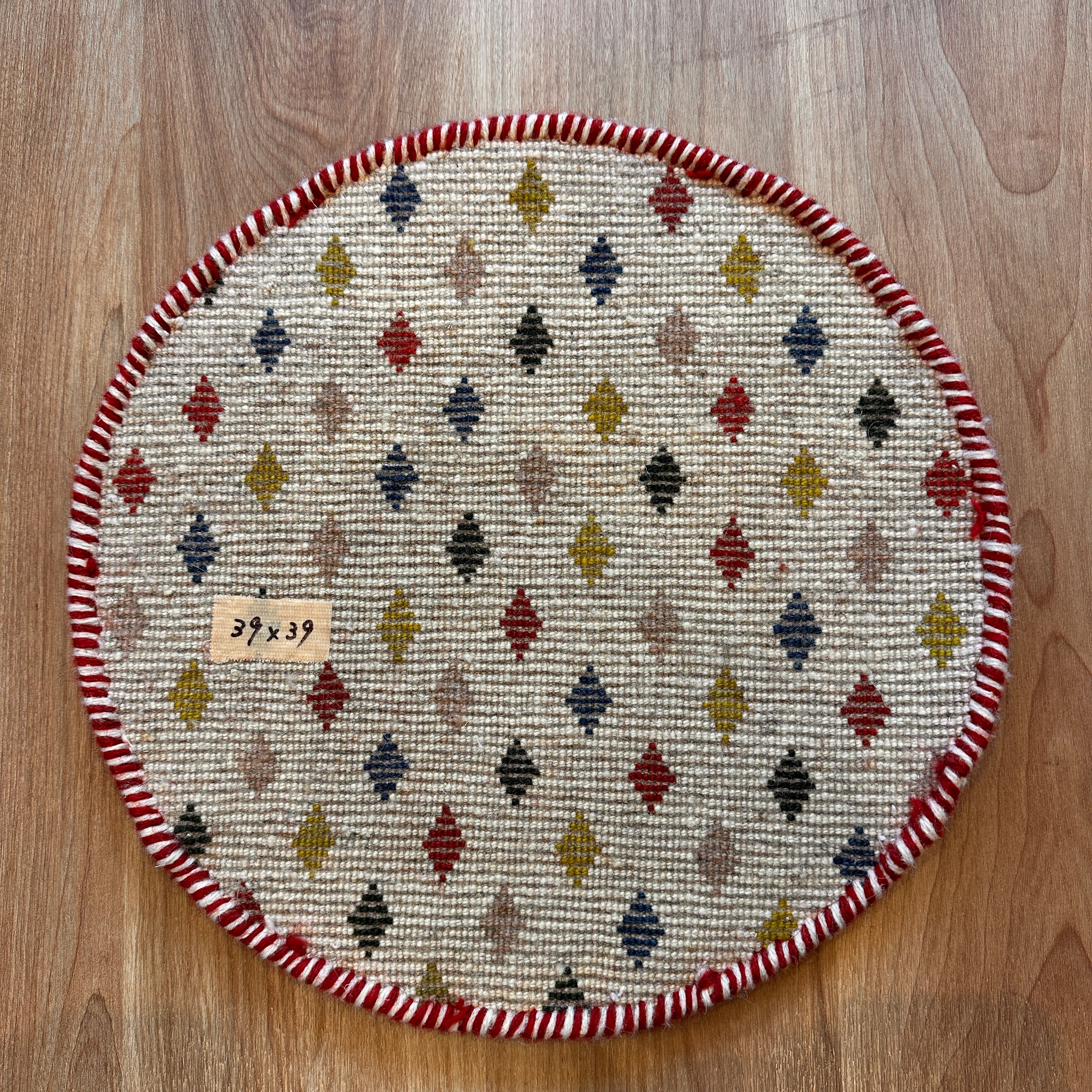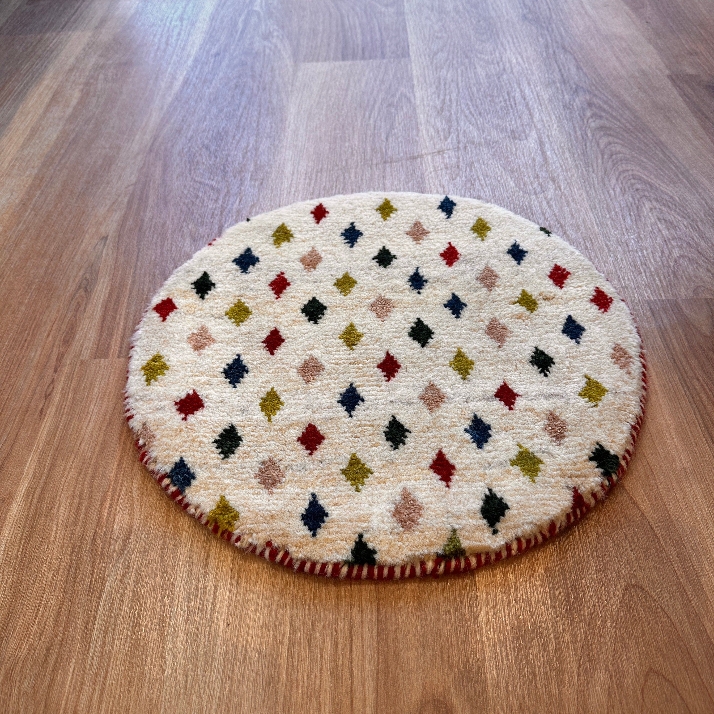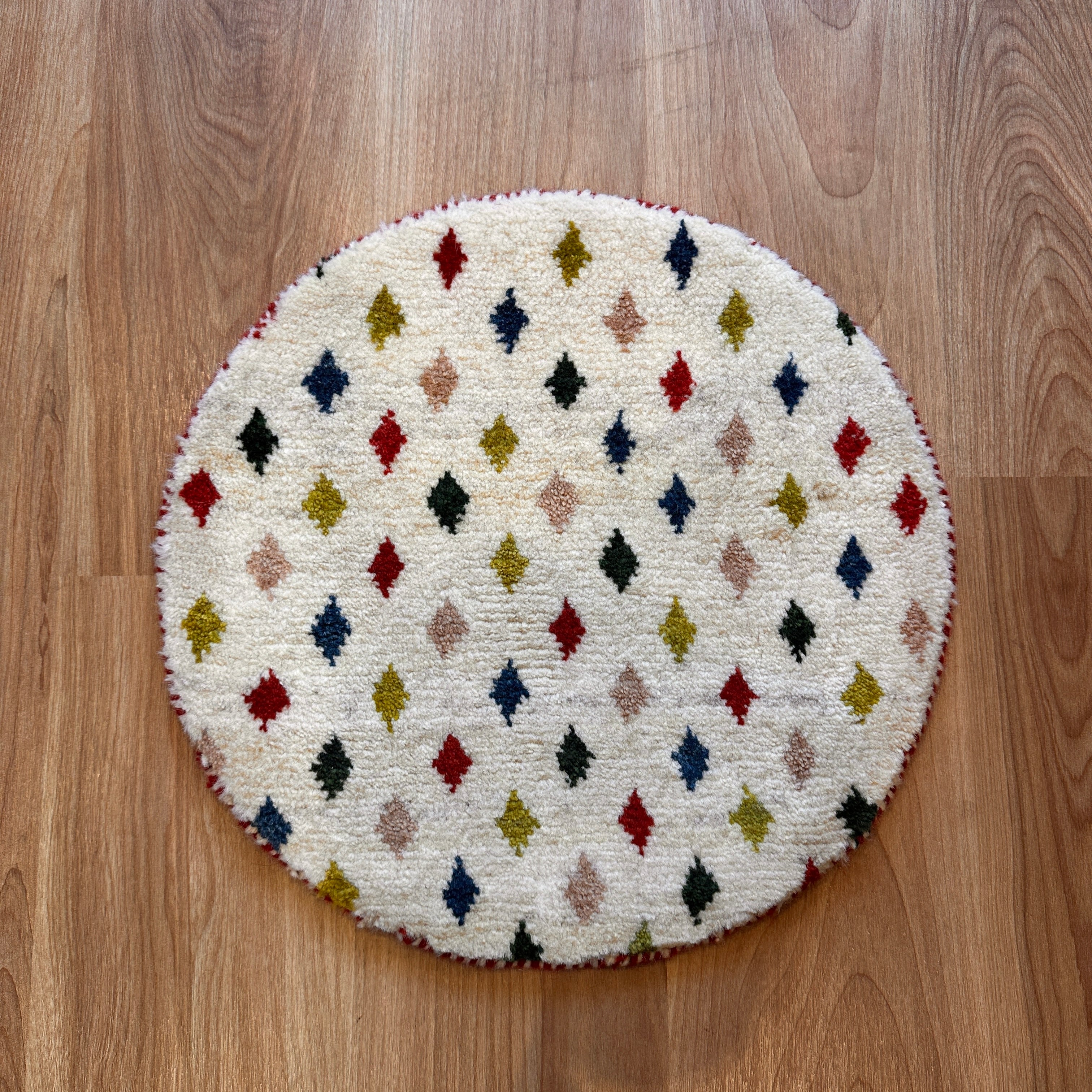 newギャッベ 円形 座布団サイズ39cm 菱形 白 手織り(GCR-5414)