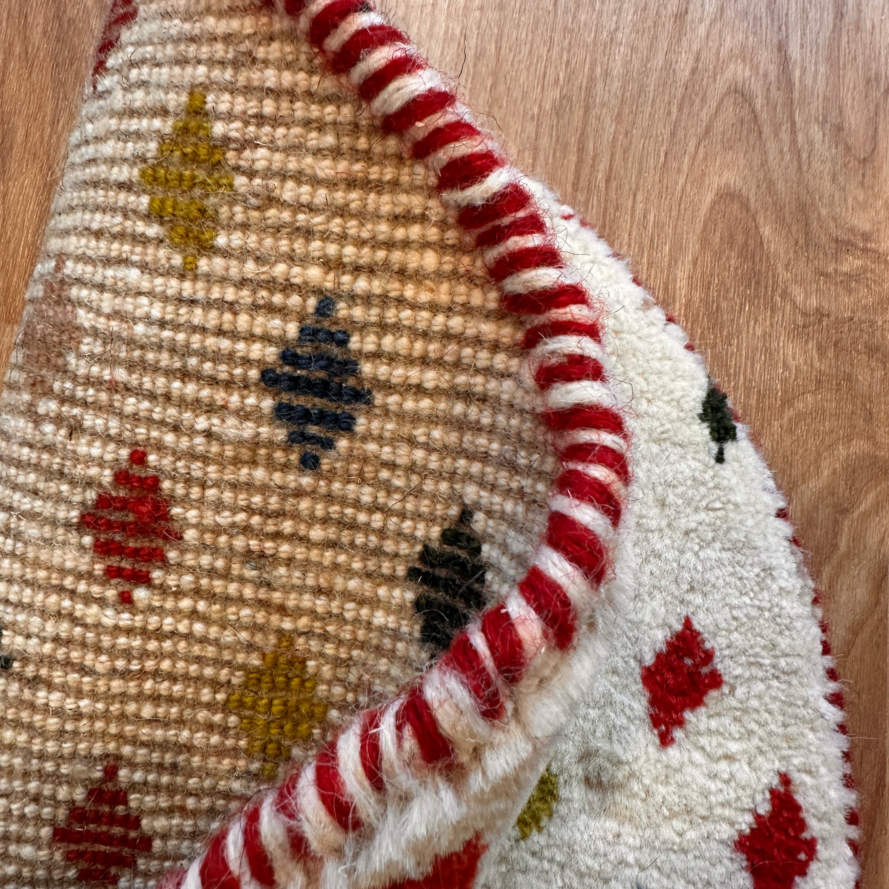 イラン シーラーズ州で織られたギャッベです。遊牧民のアイデンティティーから願いや祈りが生かされ、モチーフをバランスよく配置した円形の座布団サイズです。サイズや厚みなどにバラツキがあるのは手織りの一点もの!ギュッと目が詰まって細かなで手織りのギャッベ