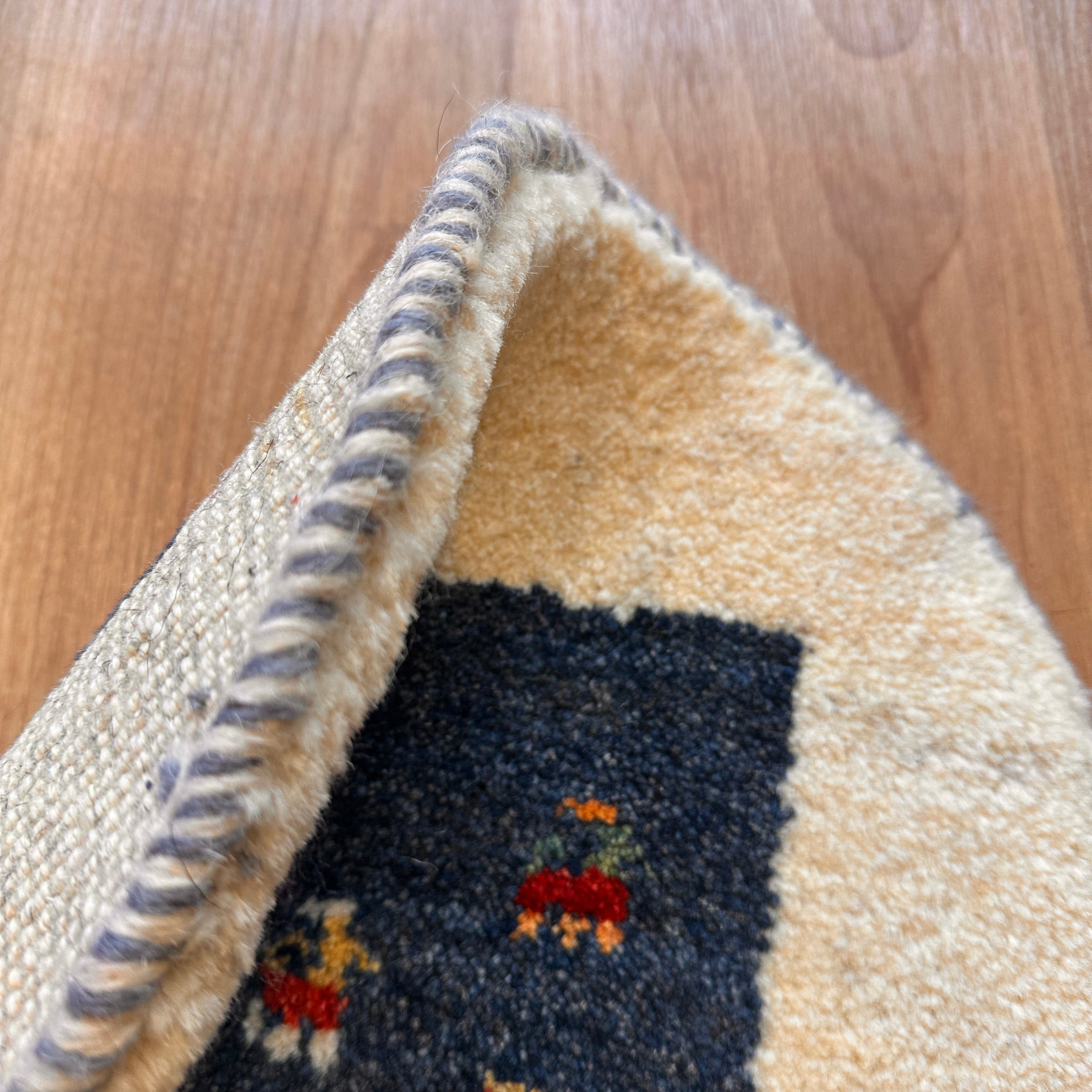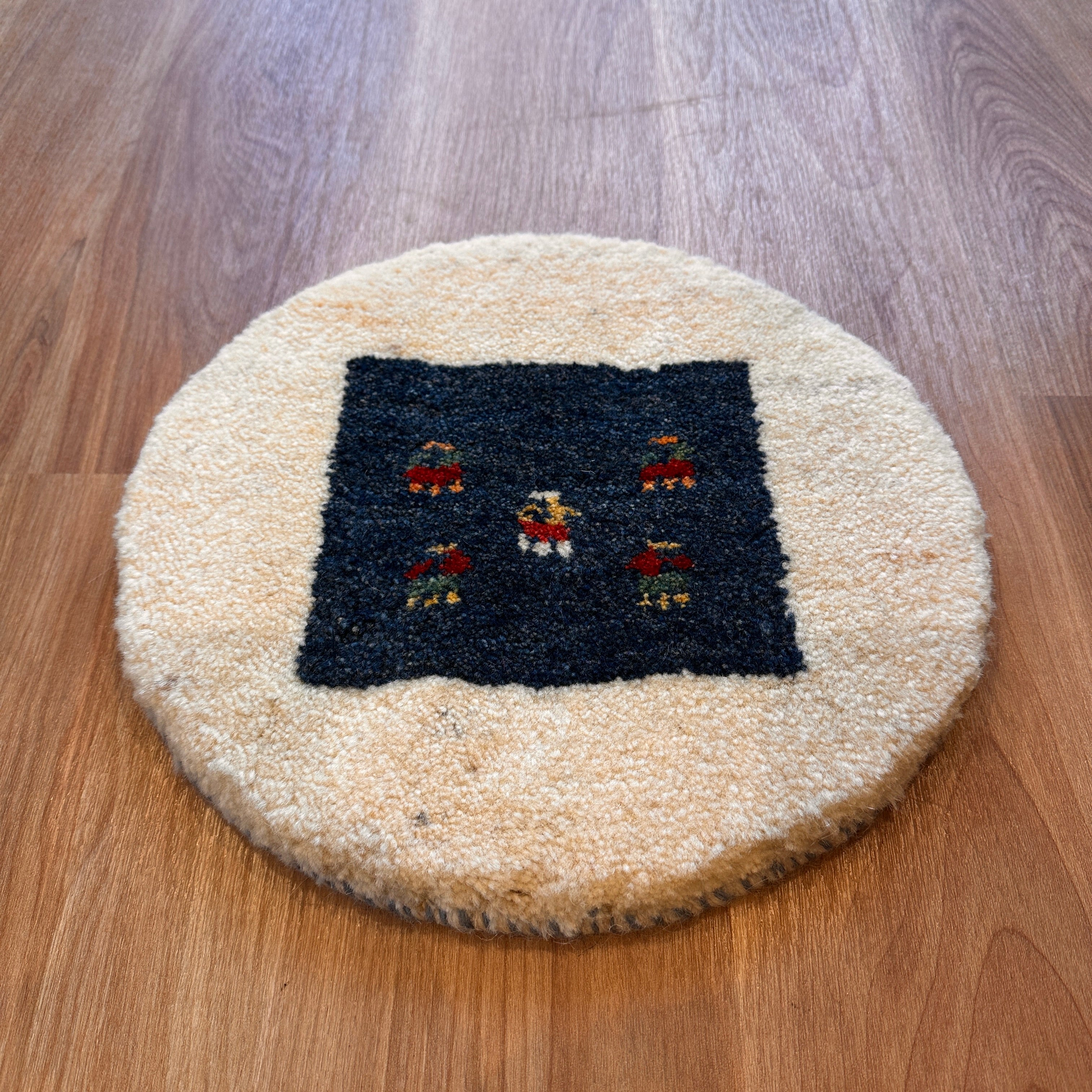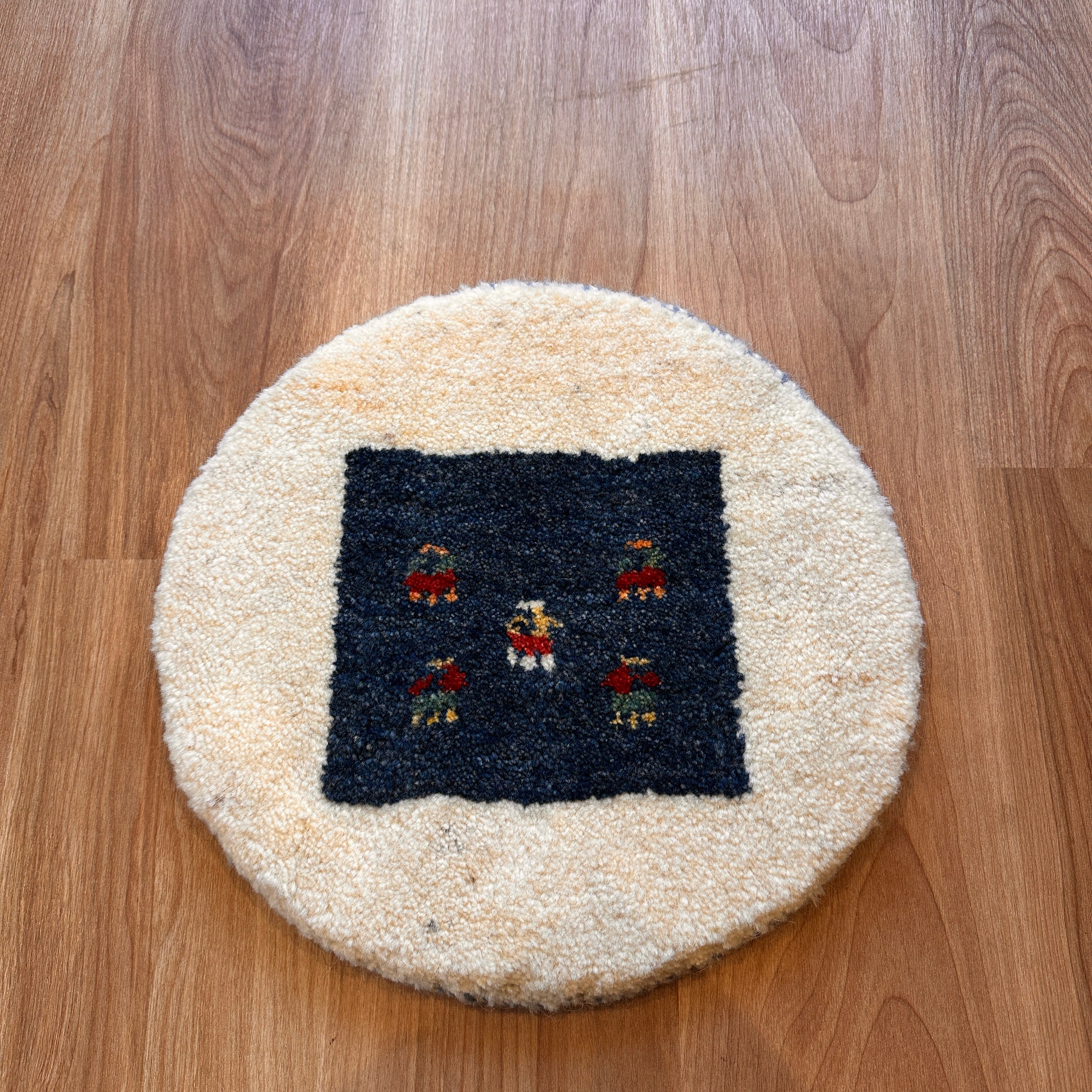 イラン シーラーズ州で織られたギャッベです。遊牧民のアイデンティティーから願いや祈りが生かされ、モチーフをバランスよく配置した円形の座布団サイズです。サイズや厚みなどにバラツキがあるのは手織りの一点もの!ギュッと目が詰まって細かなで手織りのギャッベ