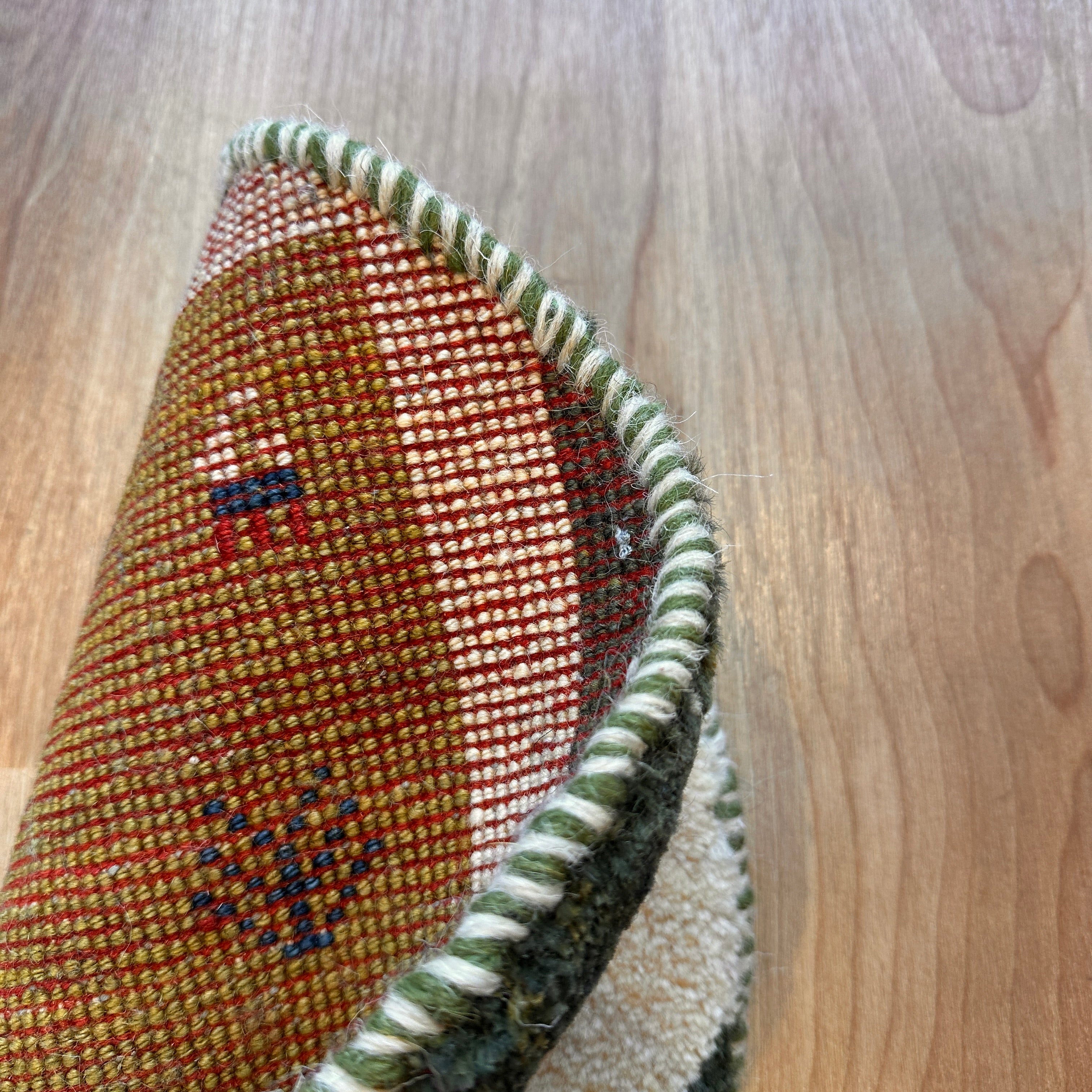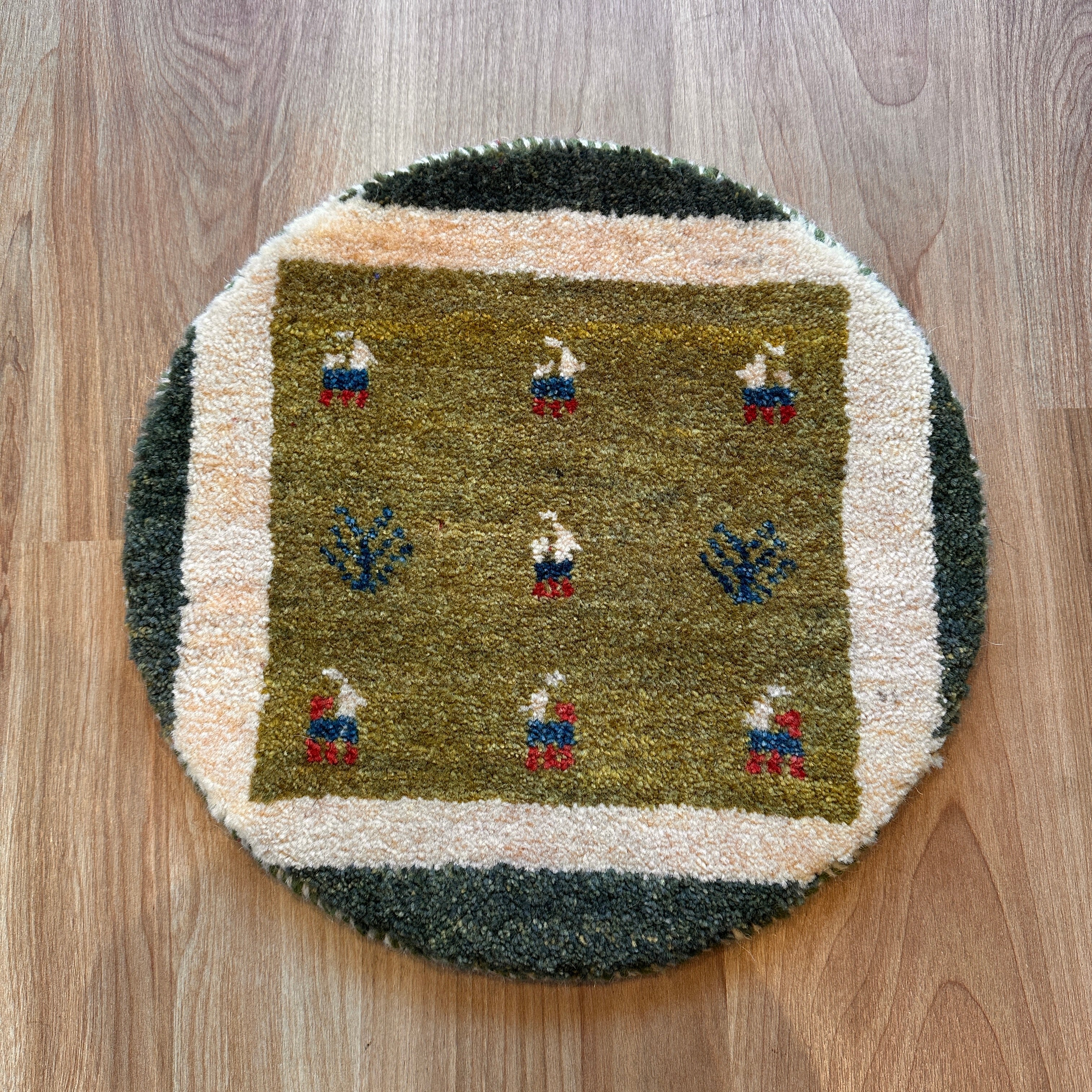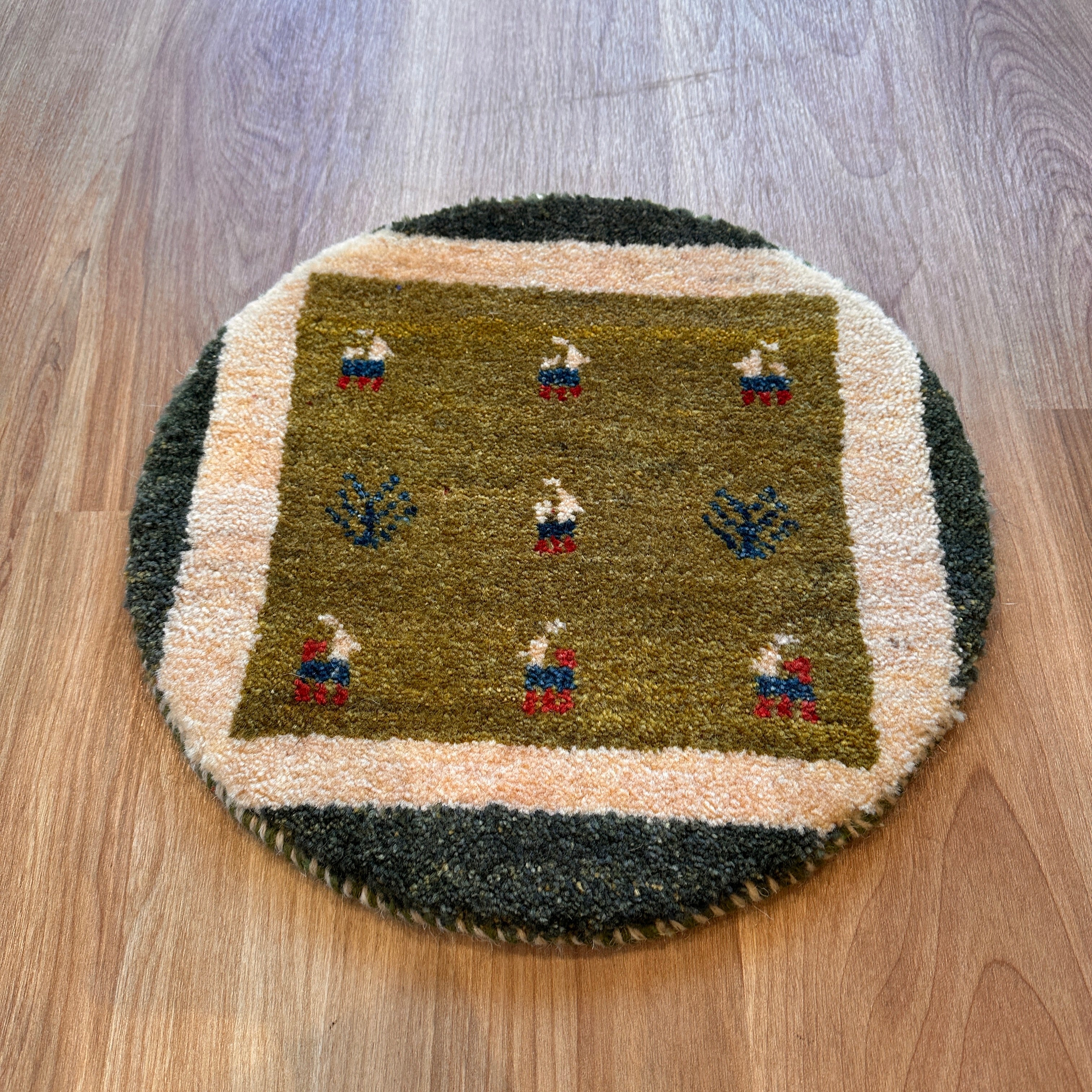 new ギャッベ 円形 座布団サイズ37cm 生命の樹 鹿 緑 手織り(GCR-5405)