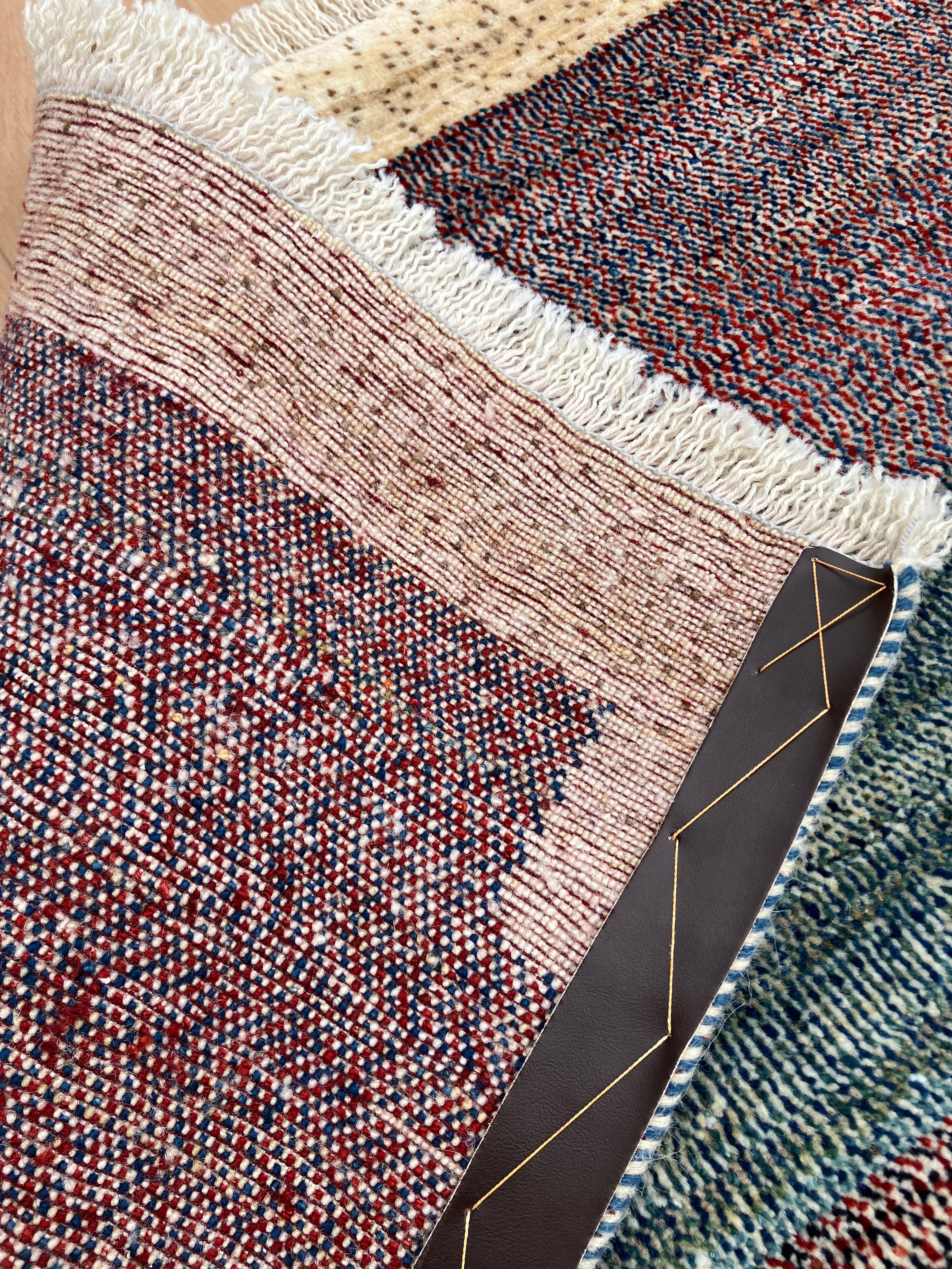 製品への拘り:当社の絨毯,ギャッベ.ラグには絨毯でいたみやすい箇所にレザーを縫っております。滑り止め、反り返し、歪み、手巻きほどけ防止のために、永くご愛用頂くためにひと手間加えております。